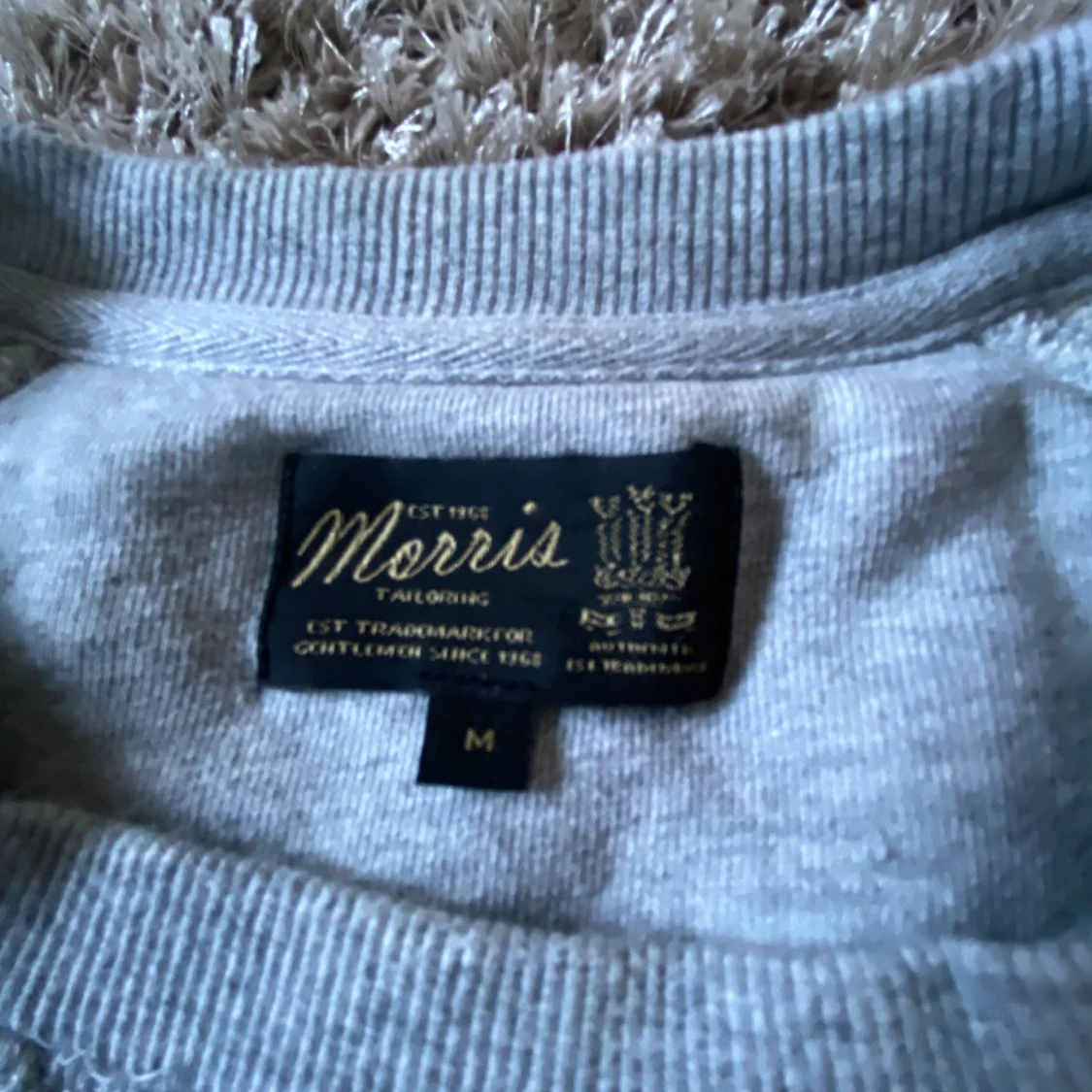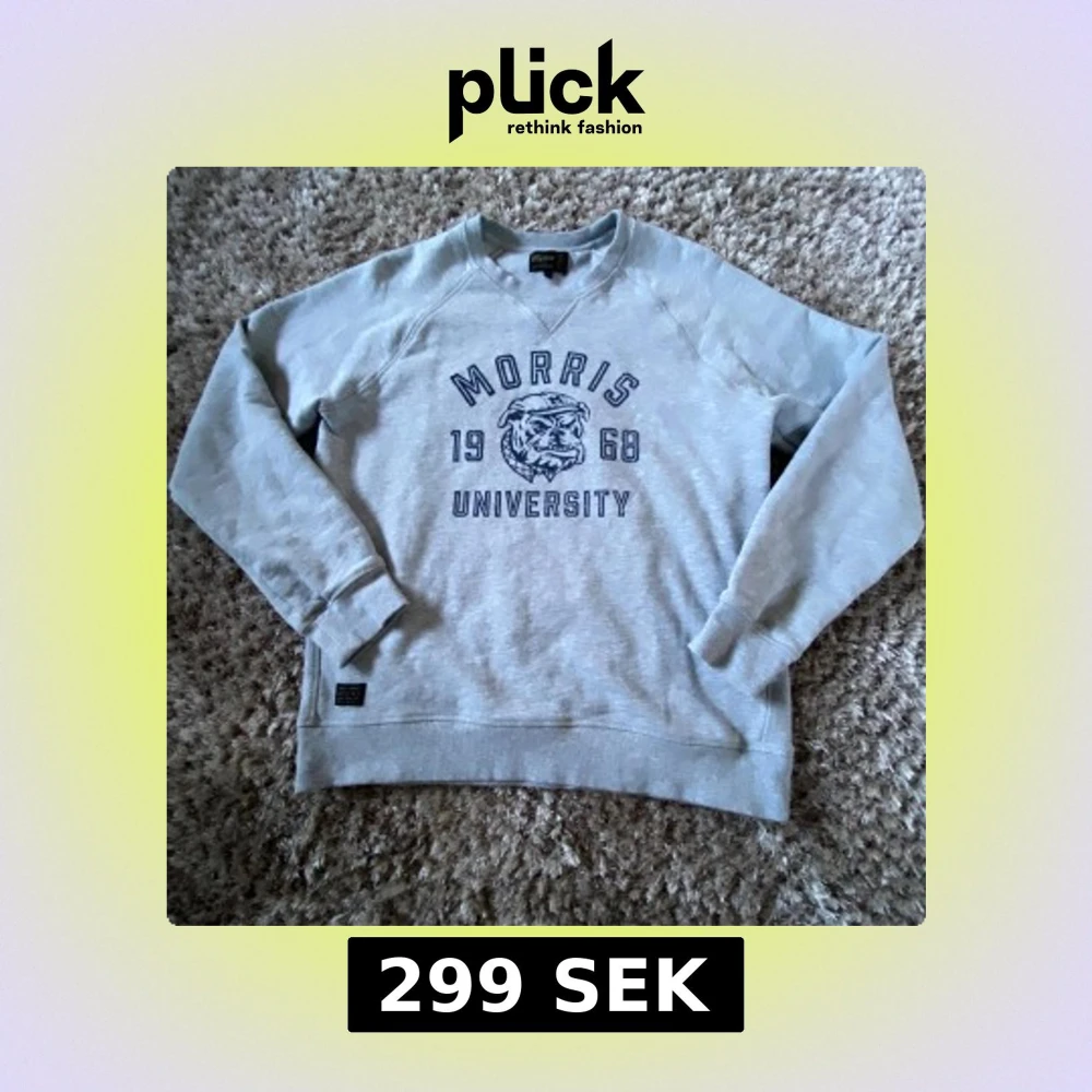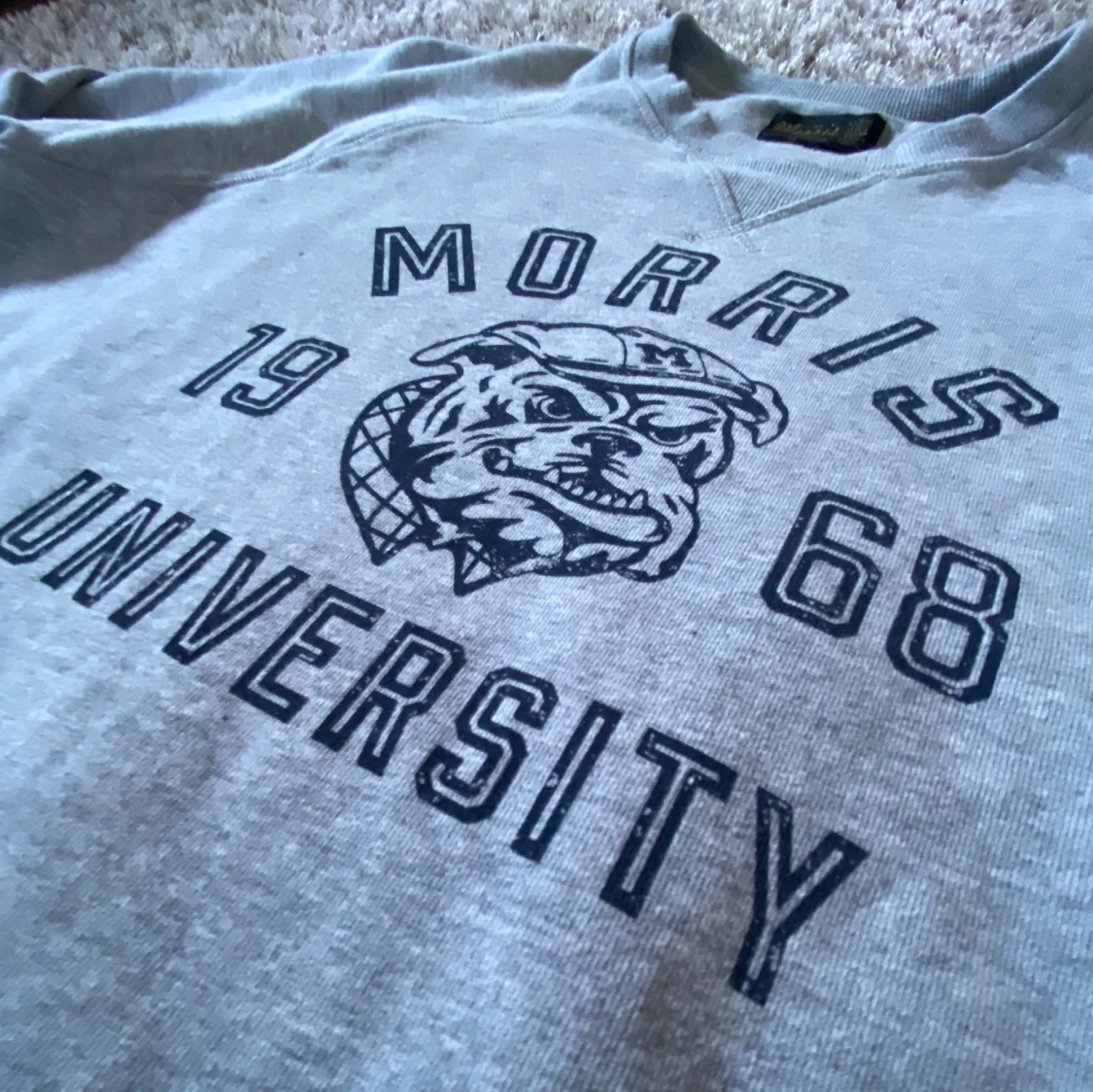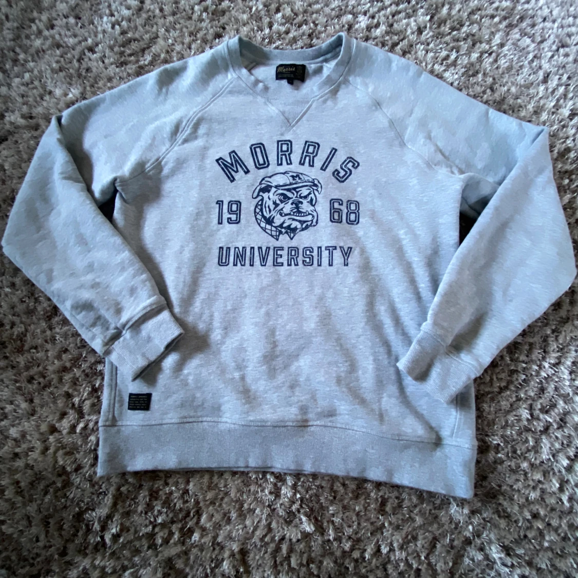 Snygg grå sweatshirt från Morris med tryck 'Morris University 1968' och en bulldog på bröstet. Tröjan har rund hals, långa ärmar och ribbade muddar och är knappt använd. Perfekt för en avslappnad och en enkel look. Har du några funderingar så är det bara att skriva👌