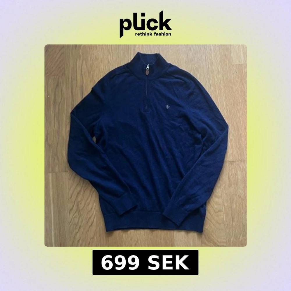 Säljer en mörkblå långärmad tröja från Morris i 100% merinoull. Tröjan har hög krage med half zip-dragkedja och en liten broderad logga på bröstet. Storleken är M men passar S. Perfekt för dig som gillar stilrena och bekväma plagg med premiumkänsla.