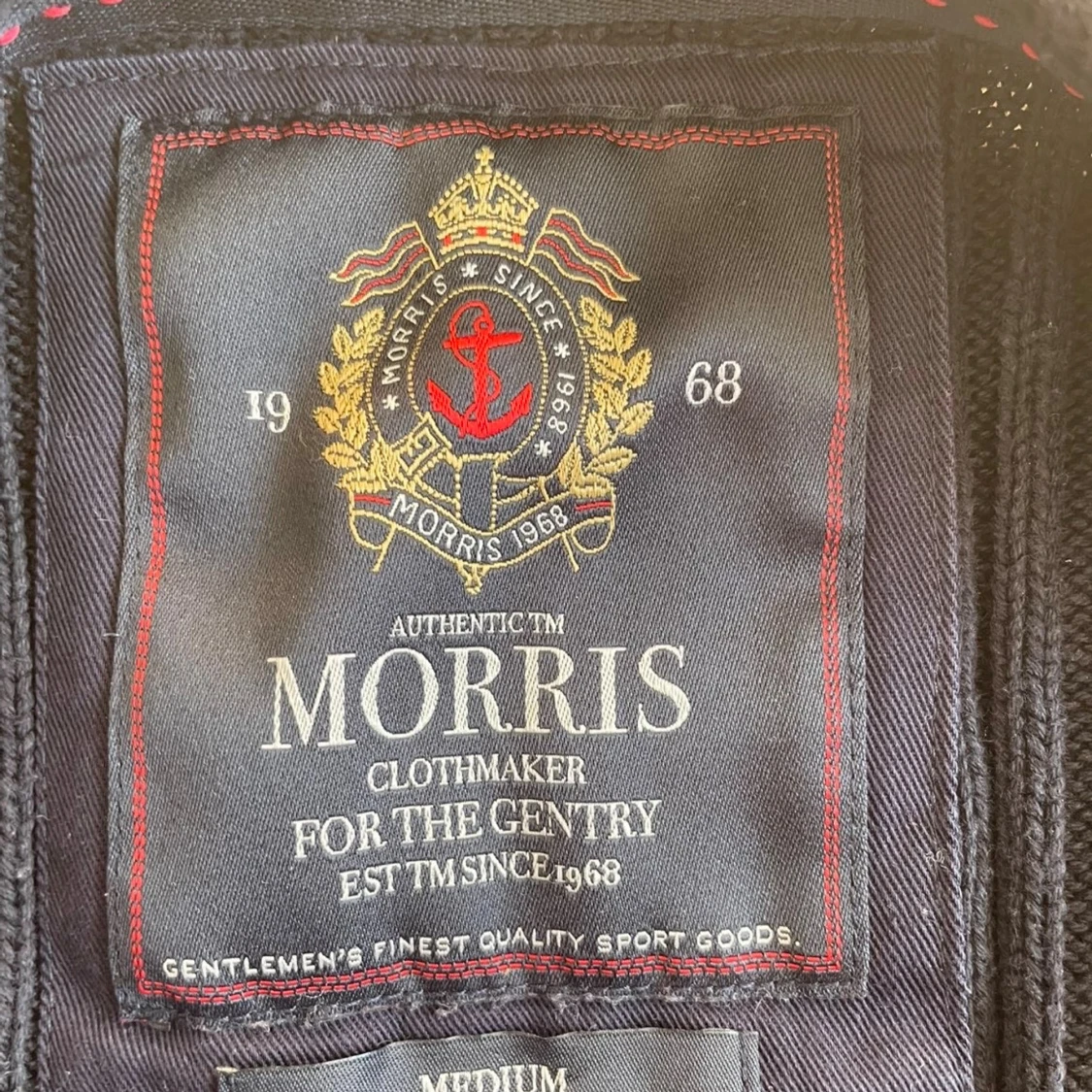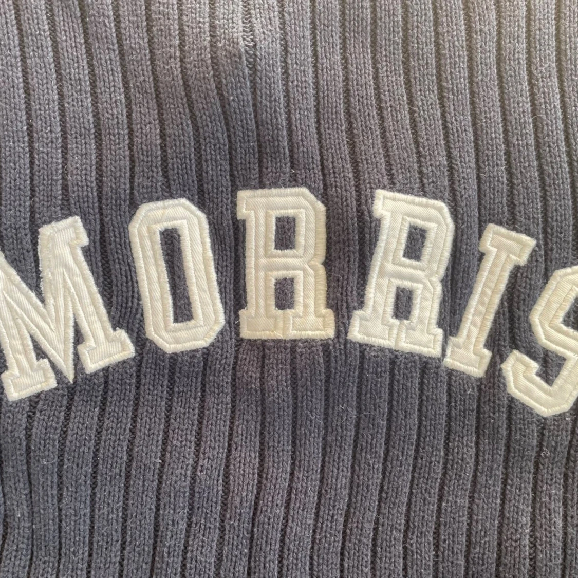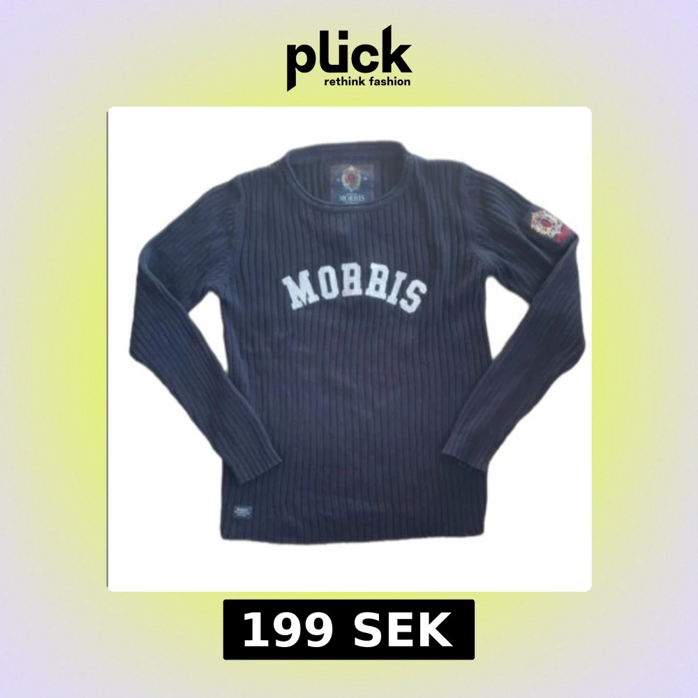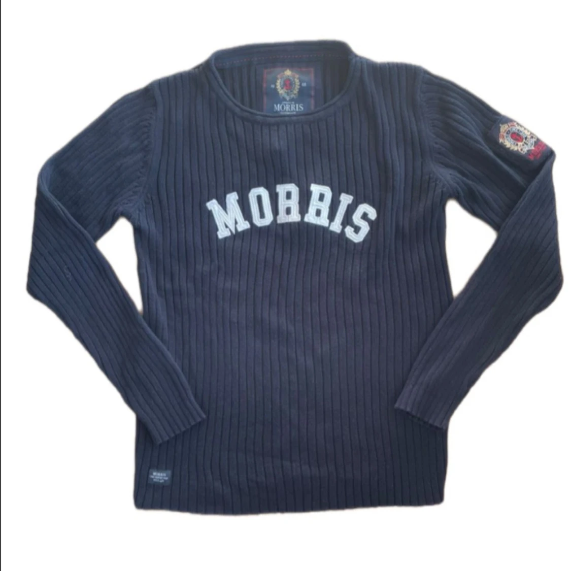 Ribbstickad marinblå tröja från Morris med vit broderad logga på bröstet och patch på ena ärmen. Långärmad och i klassisk, sportig stil. Perfekt för dig som gillar preppy vibes och snygga detaljer.