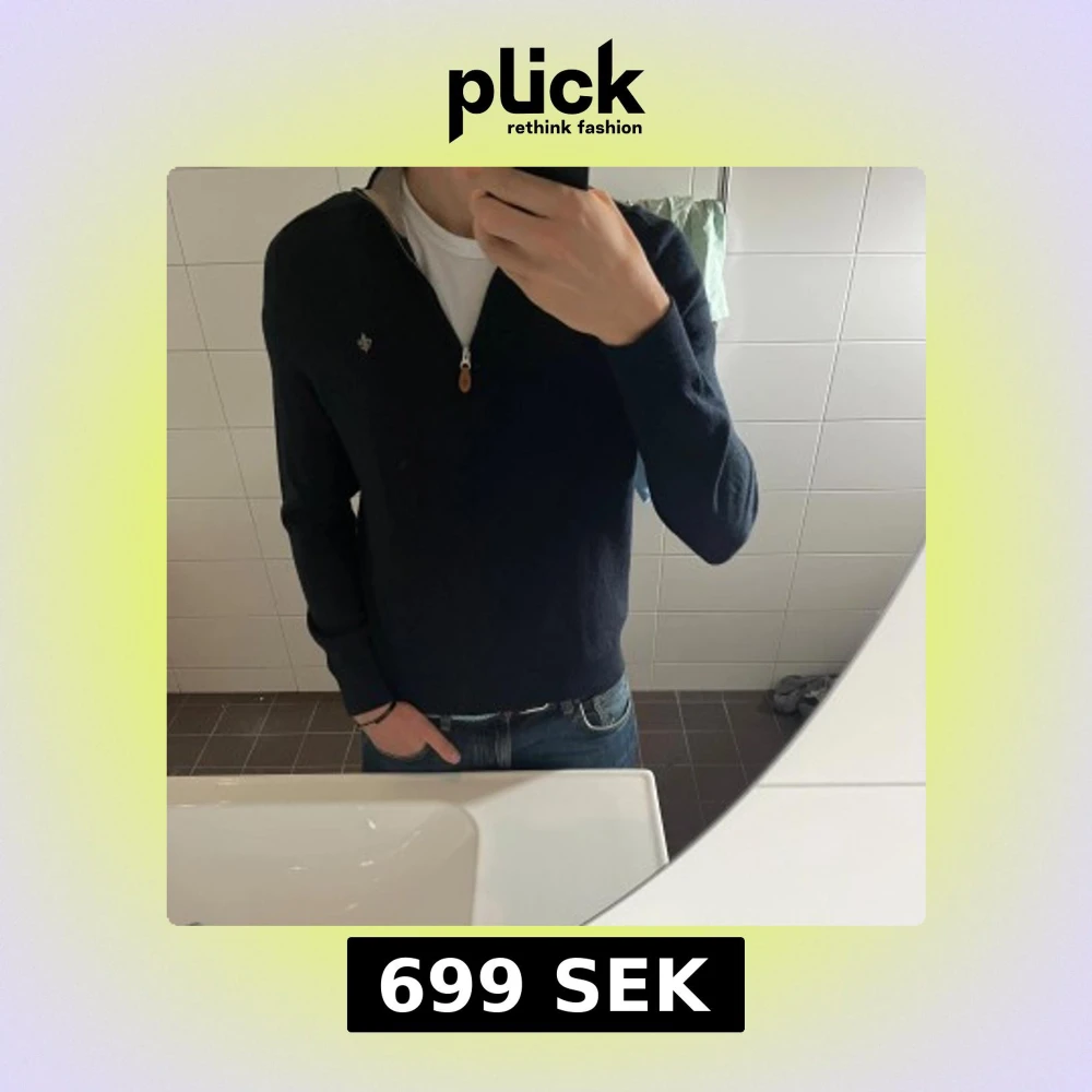 Snygg mörkblå stickad tröja från Morris med halfzip och liten broderad logga på bröstet. Tröjan har lång ärm, ribbade muddar och kontrastfärgad insida vid kragen. Perfekt till alla årstider. Har knappt använt den, som ny. Nypris 1800.