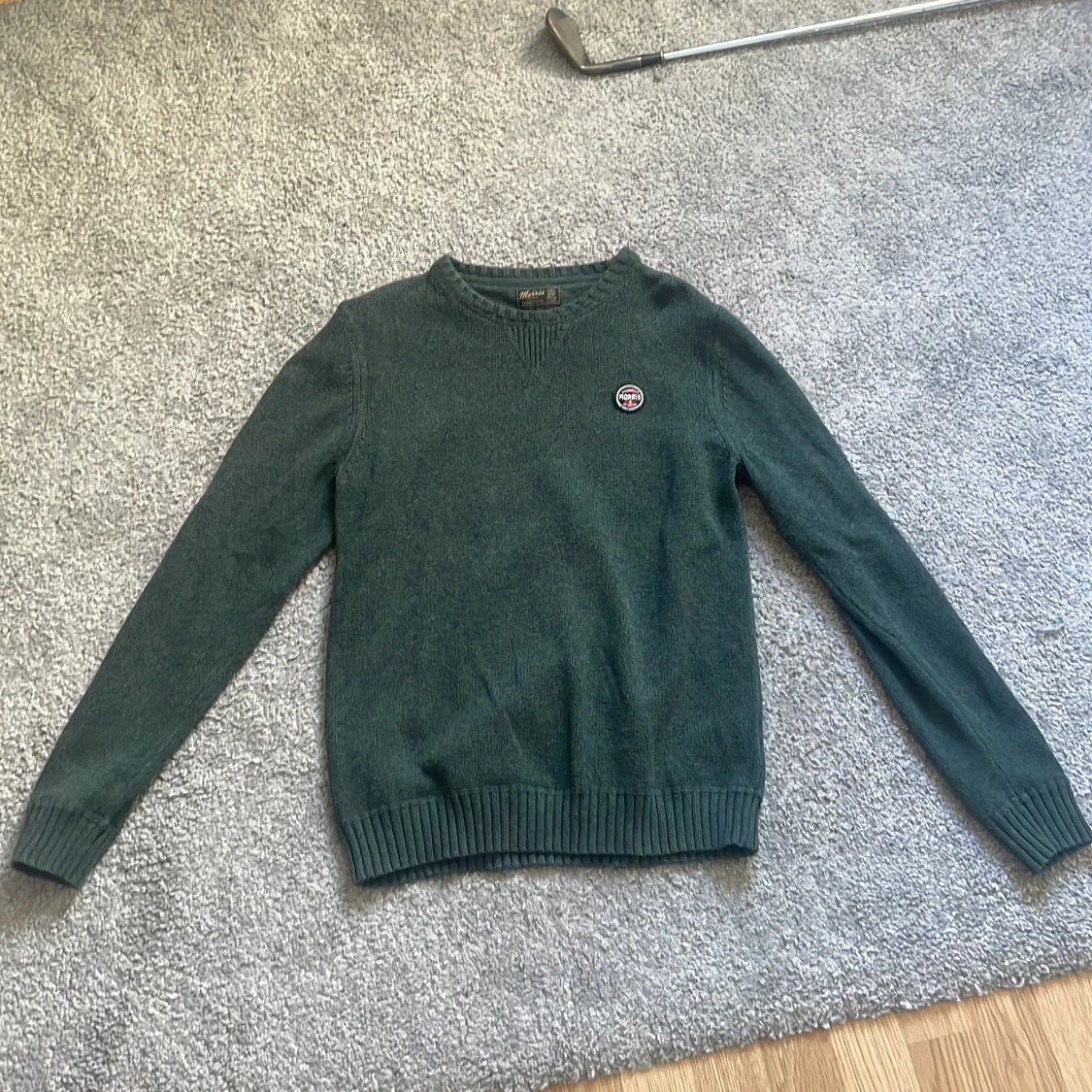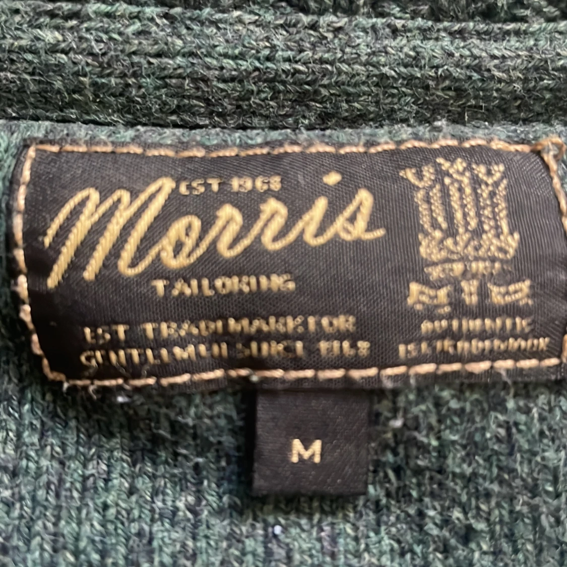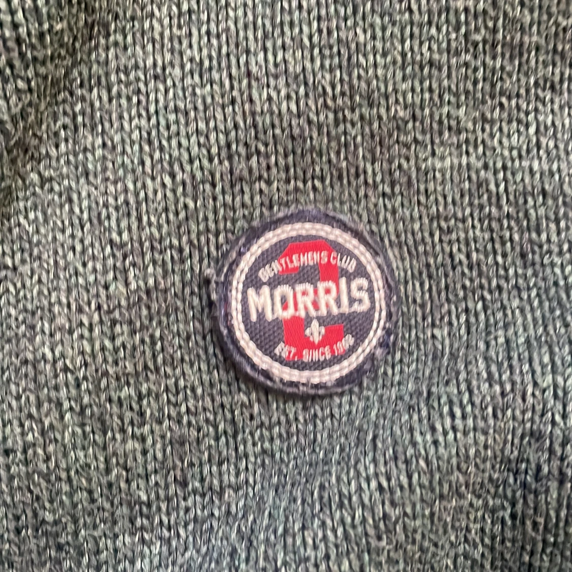 Snygg mörkgrön stickad tröja från Morris i storlek M. Tröjan har rund halsringning, ribbade muddar och ett broderat Morris-märke på bröstet. Perfekt för kyliga dagar och enkel att matcha med jeans.