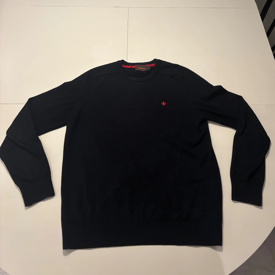 Snygg stickad Morris tröja i 100 % merino ull. Nypris ca 1500. L men passar S. Om du undrar något kontakta mig.