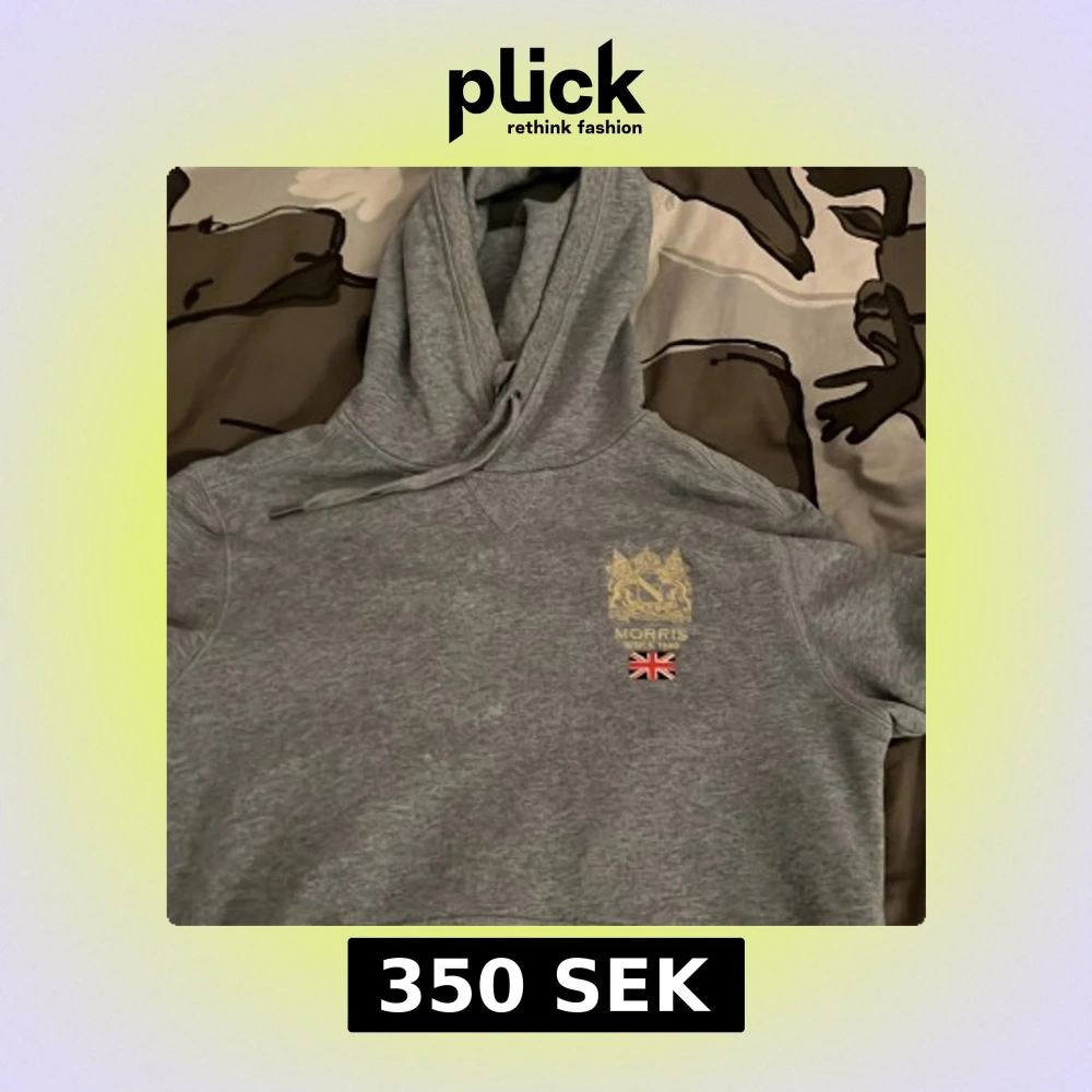 Säljer en grå hoodie från Morris med snyggt tryck i guld och en liten brittisk flagga på bröstet. Tröjan har huva med snörning och är tillverkad i mjuk bomullsmix. Perfekt för chill dagar och har en klassisk look som funkar till jeans eller joggers.