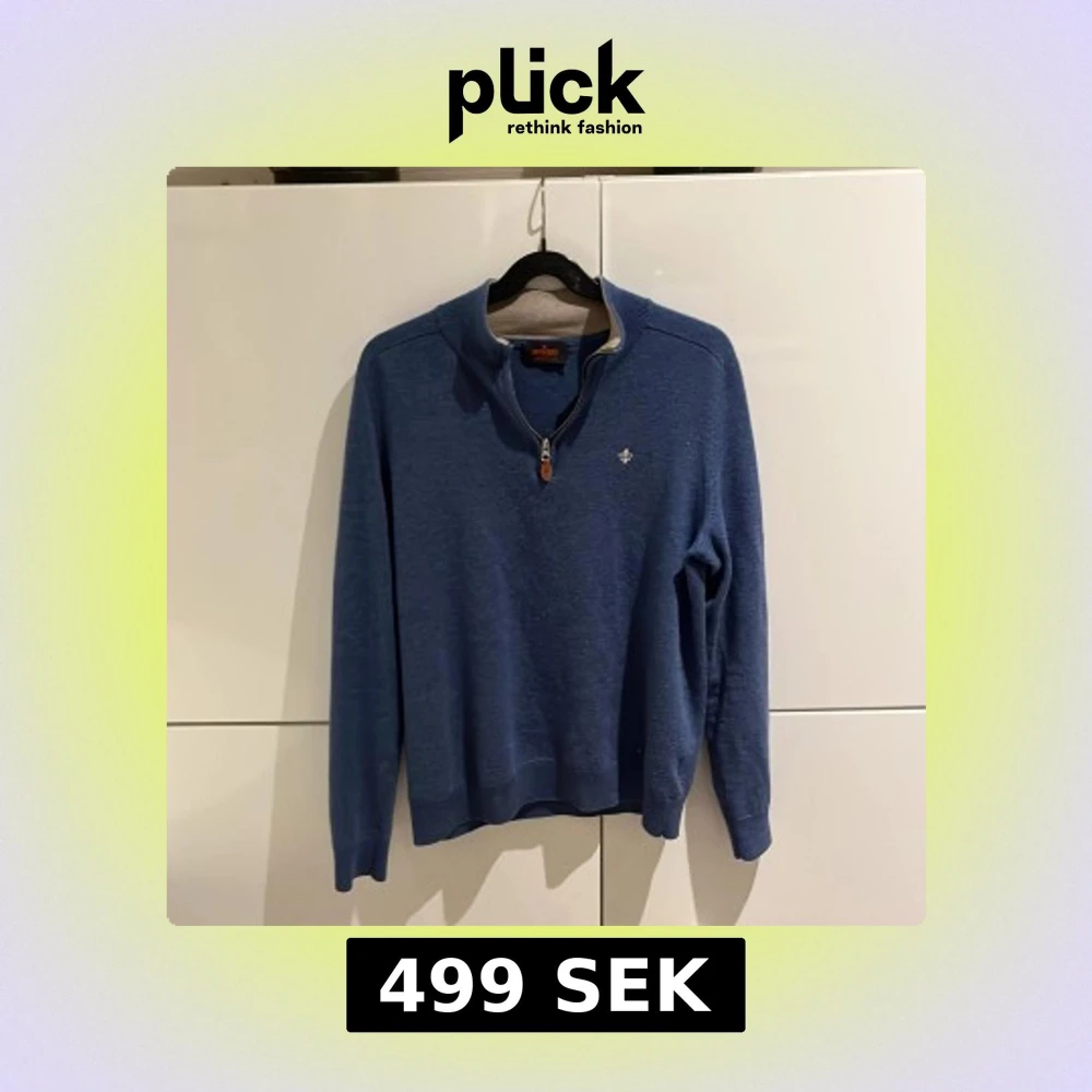 Snygg blå Morris half zip nypris 1800kr storlek L men har krympt i tvätten till s-m, ända defekten är ett håll på framsidan som visas på bild 4 men det har vi sytt ihop igen. Därav defekten dras priset ner till 499
