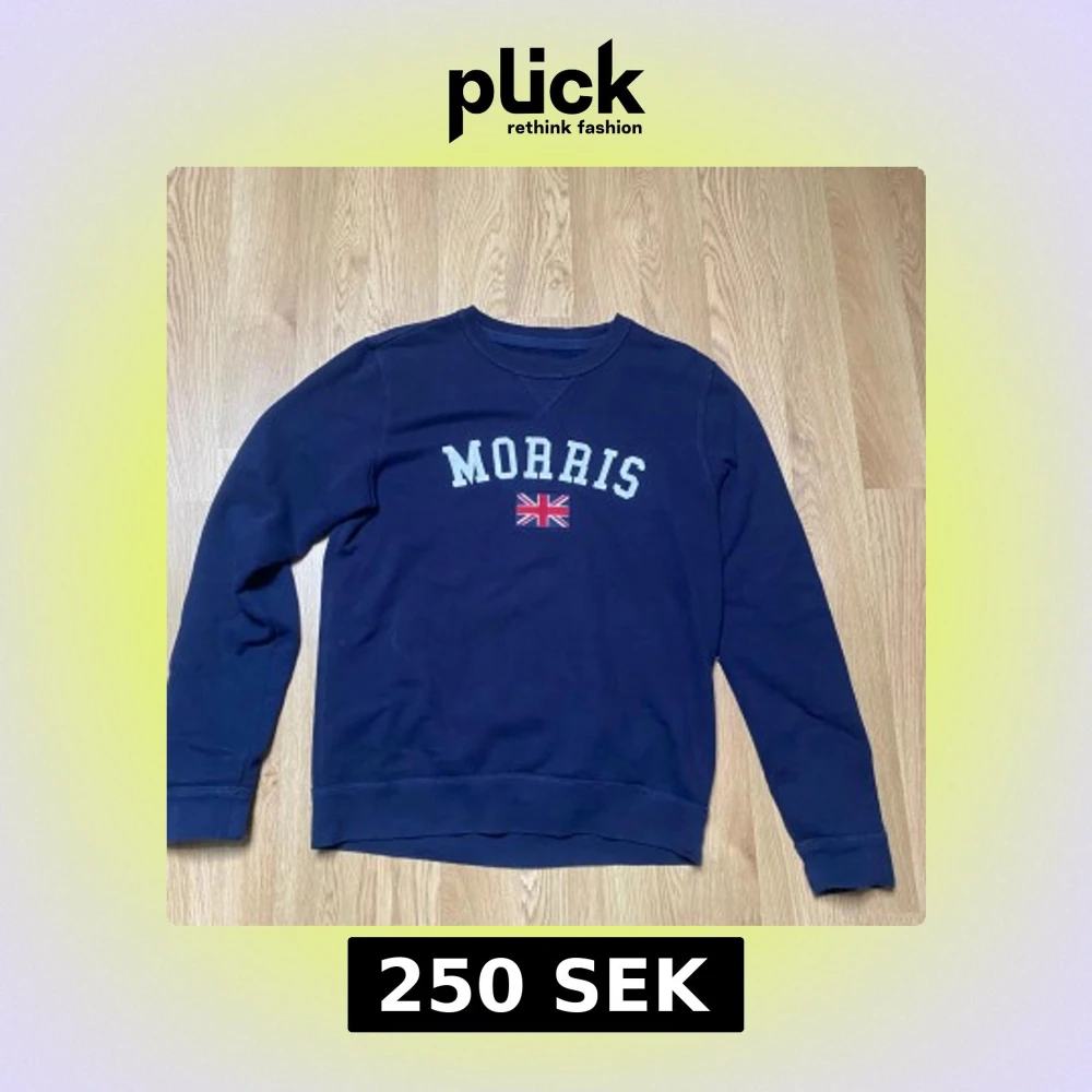 Säljer en marinblå sweatshirt från Morris med vit text och brittisk flagga på bröstet. Klassisk rund halsringning och långa ärmar. Perfekt för en stilren och avslappnad look.