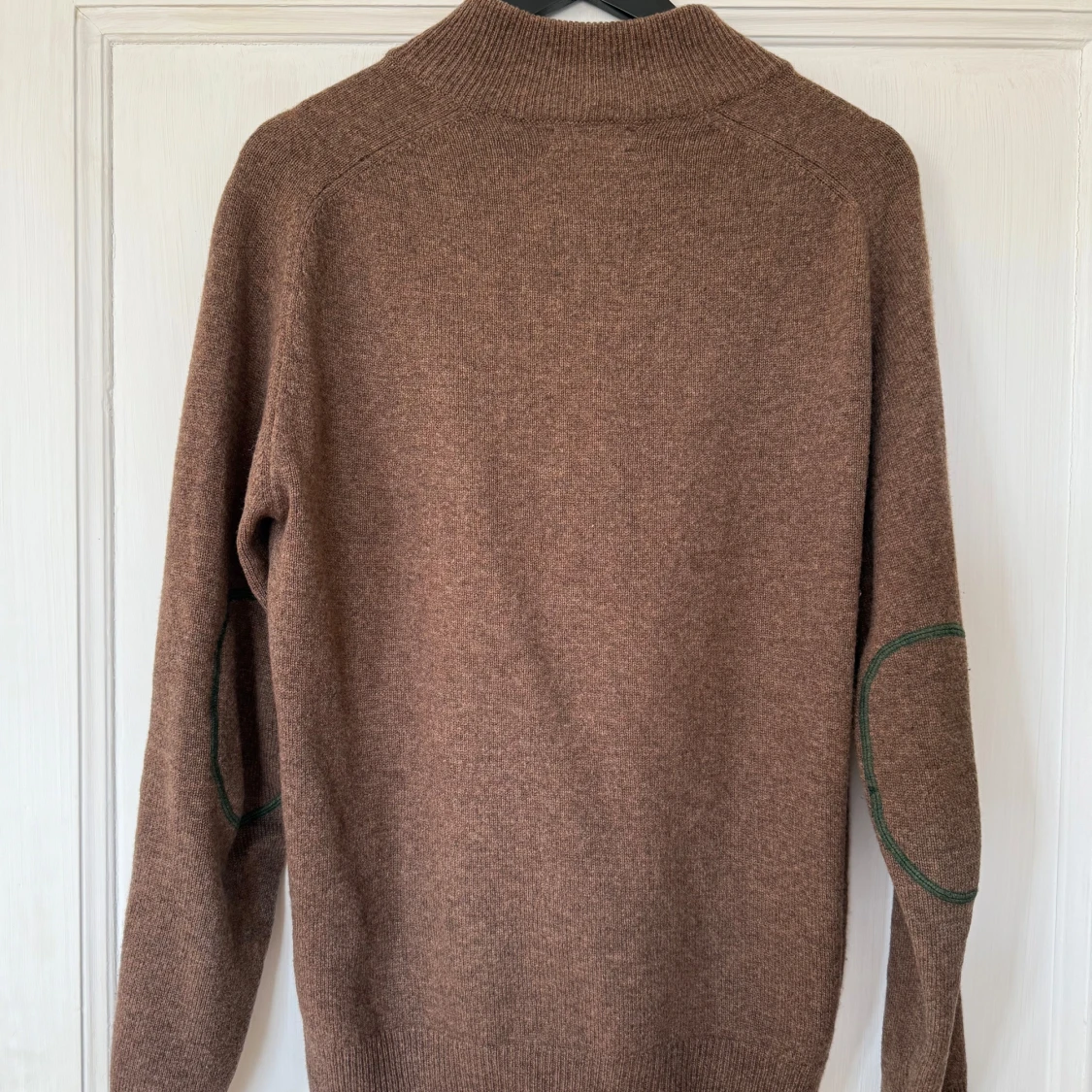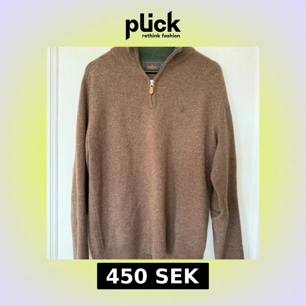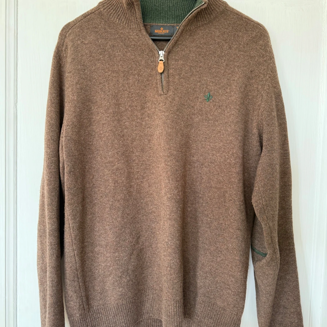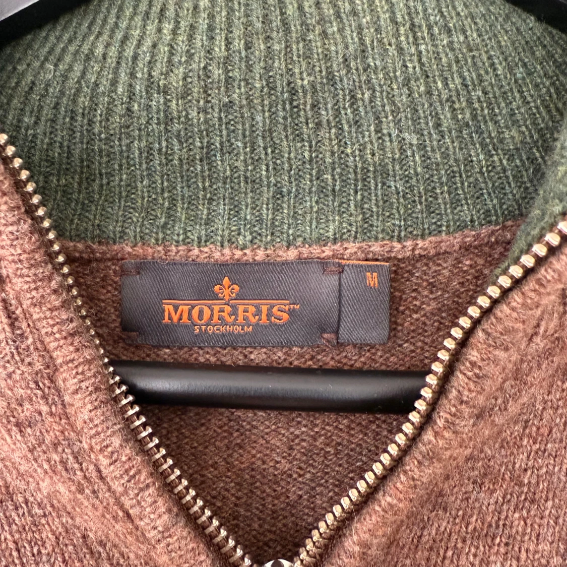 Säljer en stilren brun tröja från Morris med dragkedja och ribbad krage. Grön detaljer på ärmarna. Storlek M. Bra skick.