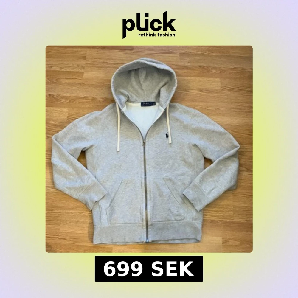 Säljer en stilren grå hoodie från Polo Ralph Lauren med dragkedja och broderad logga på bröstet. Tröjan har långa ärmar och en praktisk huva med snörning.några defekter vid armarna kan skickas bild vid behov.