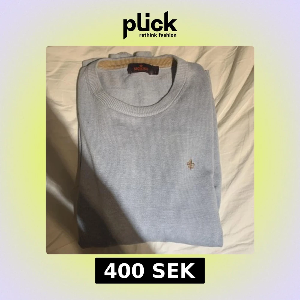 Säljer en stilren ljusblå tröja från Morris med rund halsringning och ett litet broderat emblem på bröstet. Tröjan har långa ärmar och ribbade kanter vid ärmslut och nederkant. Perfekt för en avslappnad och elegant look.