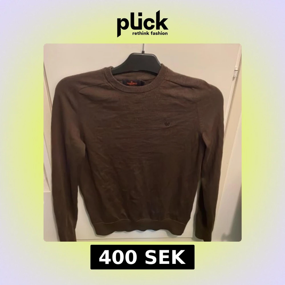 Säljer en brun tröja från Morris i 100% merinoull. Tröjan har en rund halsringning och ett diskret broderat emblem på bröstet. Perfekt för kyligare dagar.