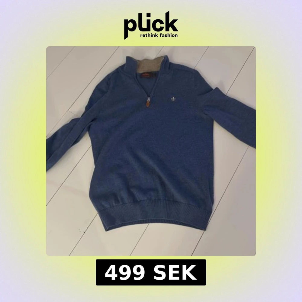 Säljer en stilren blå tröja från Morris i 100% merinoull. Tröjan har en dragkedja vid halsen och ett litet broderat emblem på bröstet. Perfekt för kyligare dagar. Bra skick och storlek s vuxen