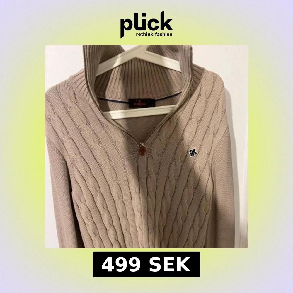 Snygg beige stickad tröja från Morris med kabelstickat mönster och ribbad hög krage. Tröjan har en half zip-dragkedja framtill och en liten broderad logga på bröstet i storlek S! Använd fåtal gånger.