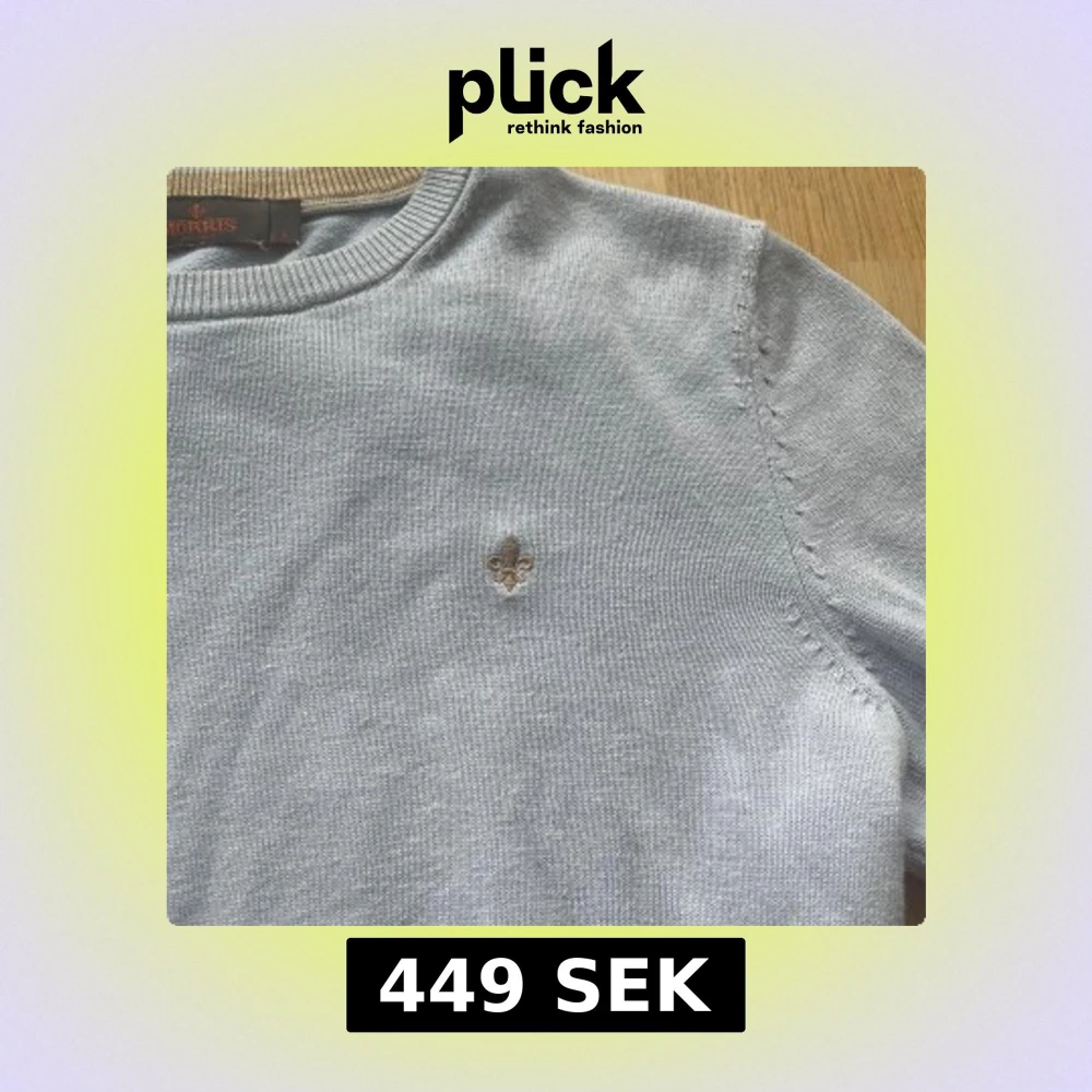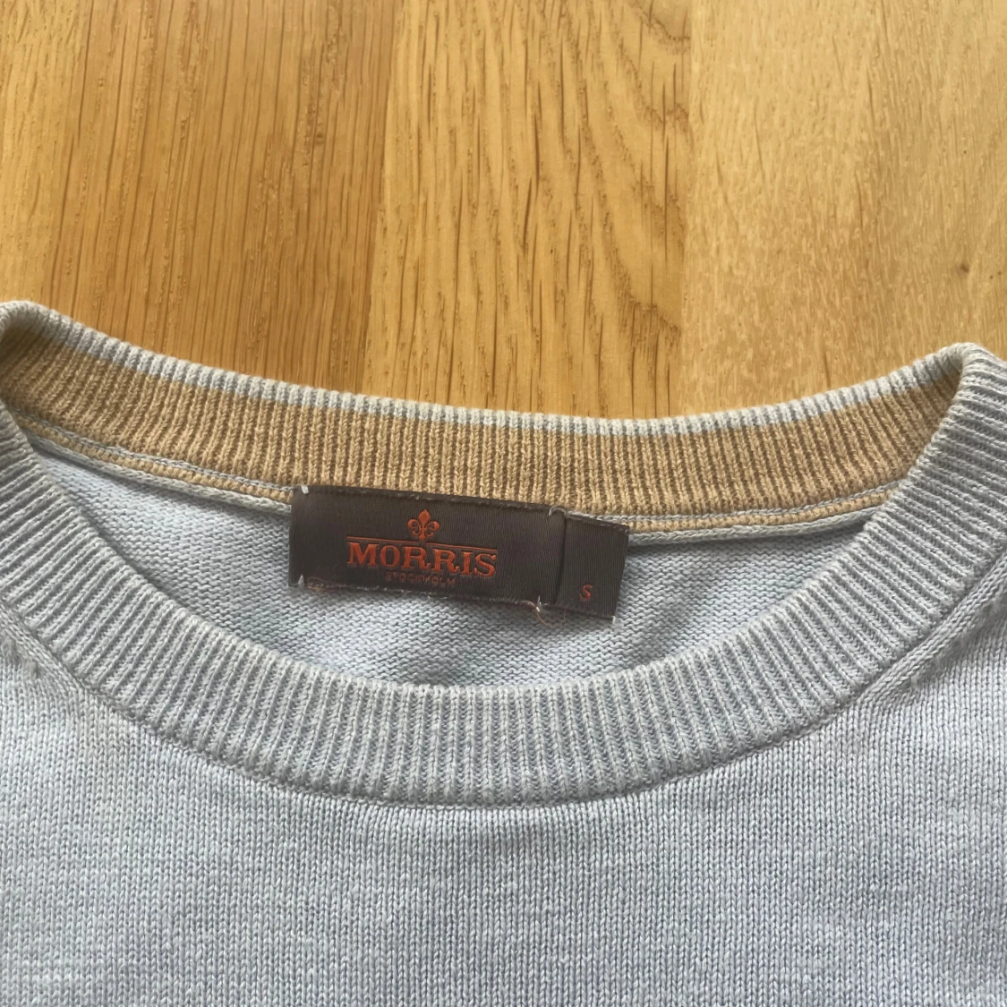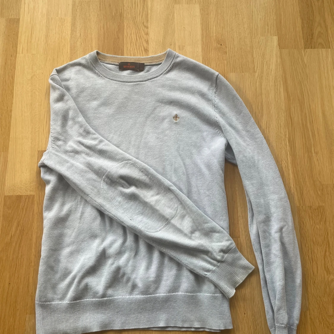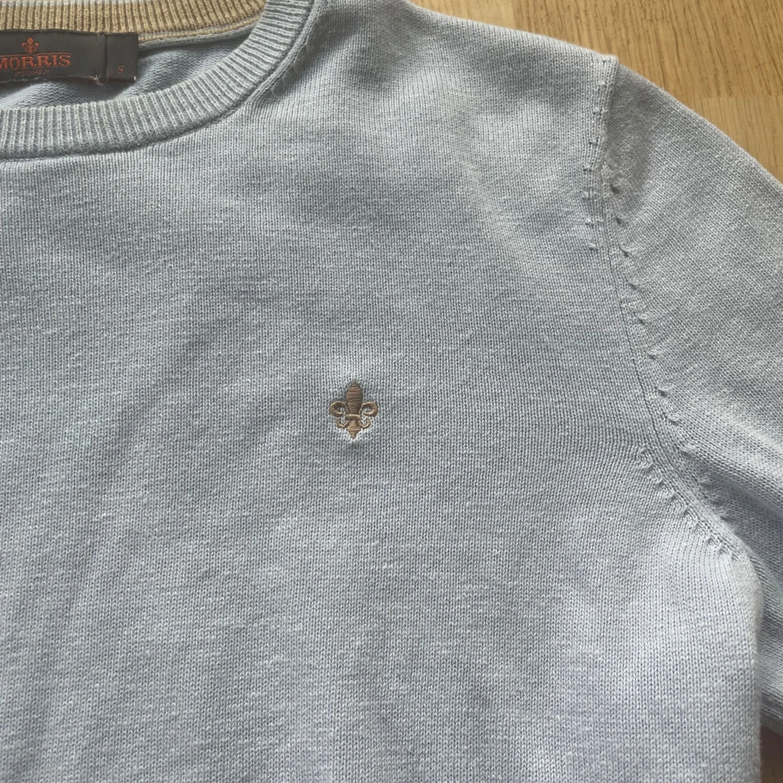 Snygg ljusblå stickad tröja från Morris med rund hals och broderad logga på bröstet. Mycket sparsamt använd. Tröjan har ribbade muddar och en go passform, perfekt till dem kyligare dagarna. Fråga om det är något! 9/10 skick