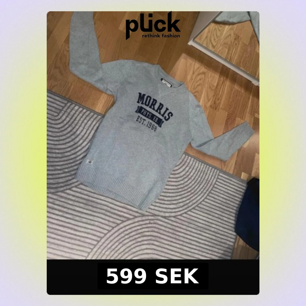 Snygg grå stickad tröja från Morris Gents i storlek small. Tröjan har mörkblå text med 'MORRIS' på bröstet och ribbade muddar vid ärmslut och nederkant. Perfekt för dig som gillar klassisk college-stil och vill ha något bekvämt och stilrent.
