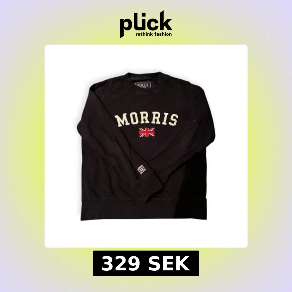 Svart sweatshirt från Morris med stor broderad logga och Union Jack-flagga på bröstet. Tröjan har rund hals, långa ärmar och ribbade muddar. Tillverkad i mjuk bomull som är skön att ha på sig. Perfekt för dig som gillar klassisk brittisk stil.