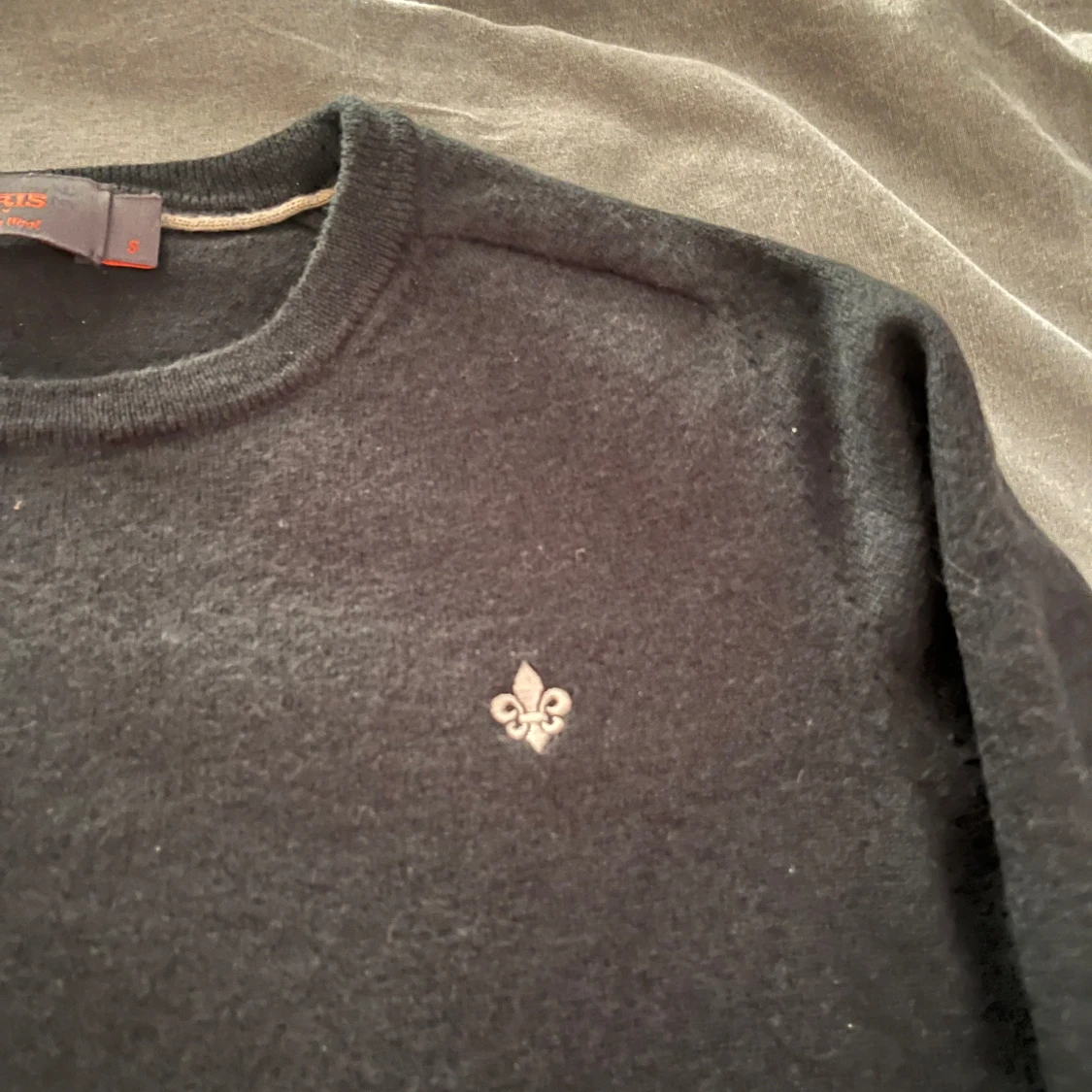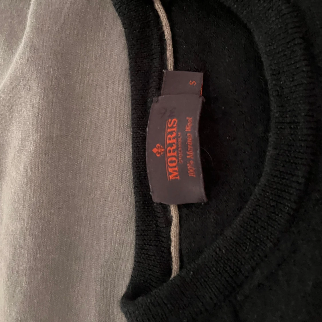 Säljer en stilren svart tröja från Morris i 100% merinoull. Tröjan har en liten broderad detalj på bröstet och rund halsringning. Perfekt för en elegant och bekväm look.