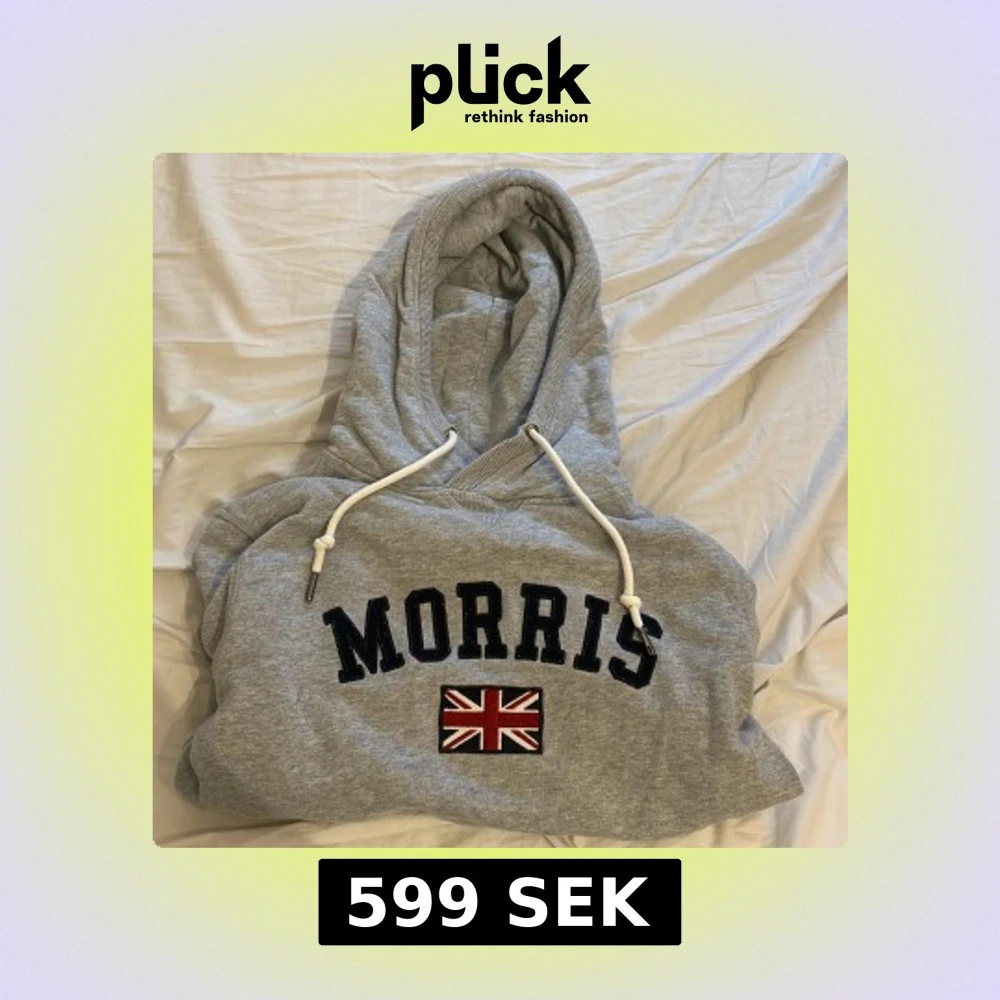 Säljer en grå hoodie från Morris med svart broderad logga och brittisk flagga på bröstet. Tröjan har huva med vita snören och är perfekt för en avslappnad stil. Klassisk och stilren design.
