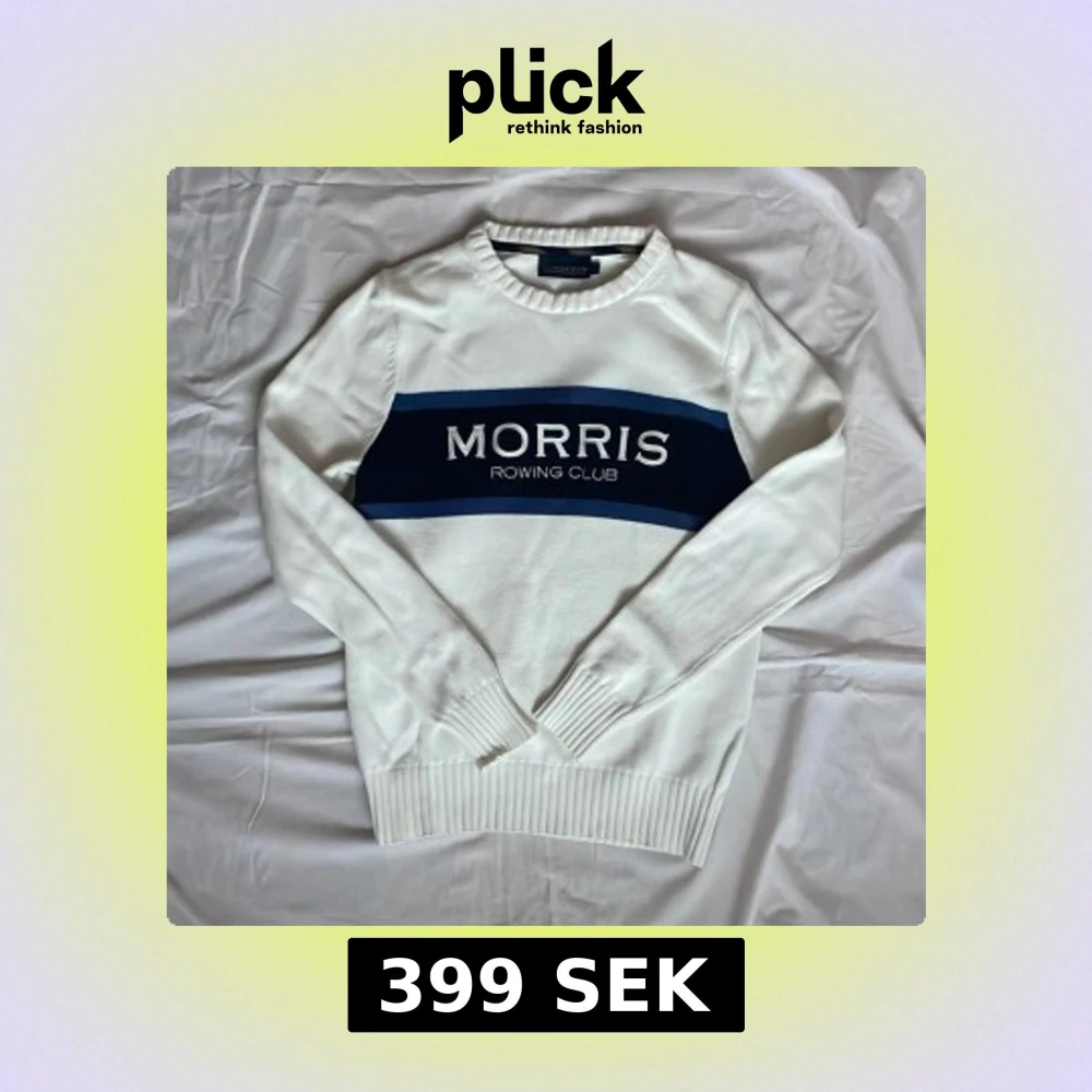 Vit stickad tröja från Morris Rowing Club med blått och mörkblått band över bröstet och broderad logga. Rund halsringning och ribbade muddar vid ärmslut och nederkant. Perfekt för en stilren och sportig look. Nyskick