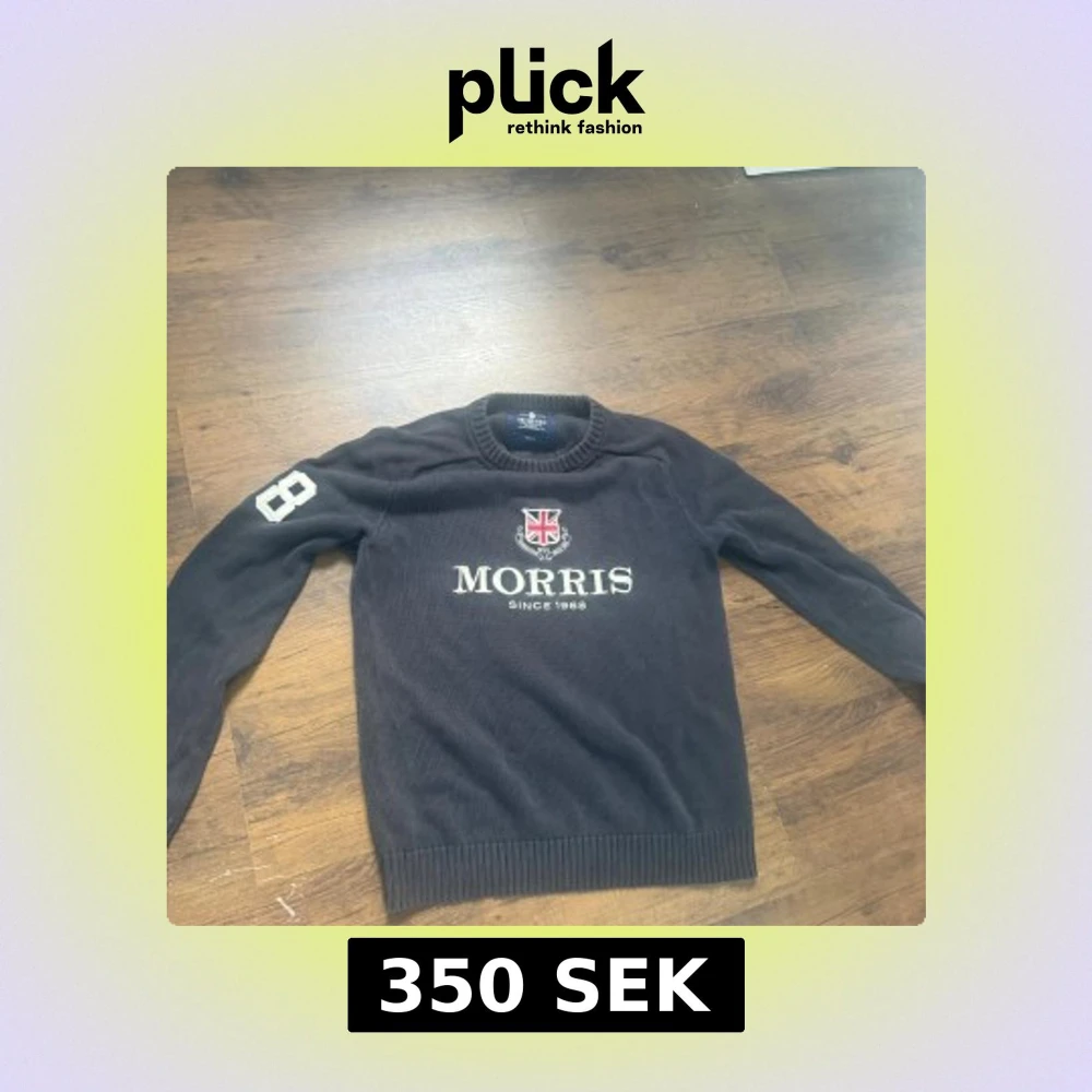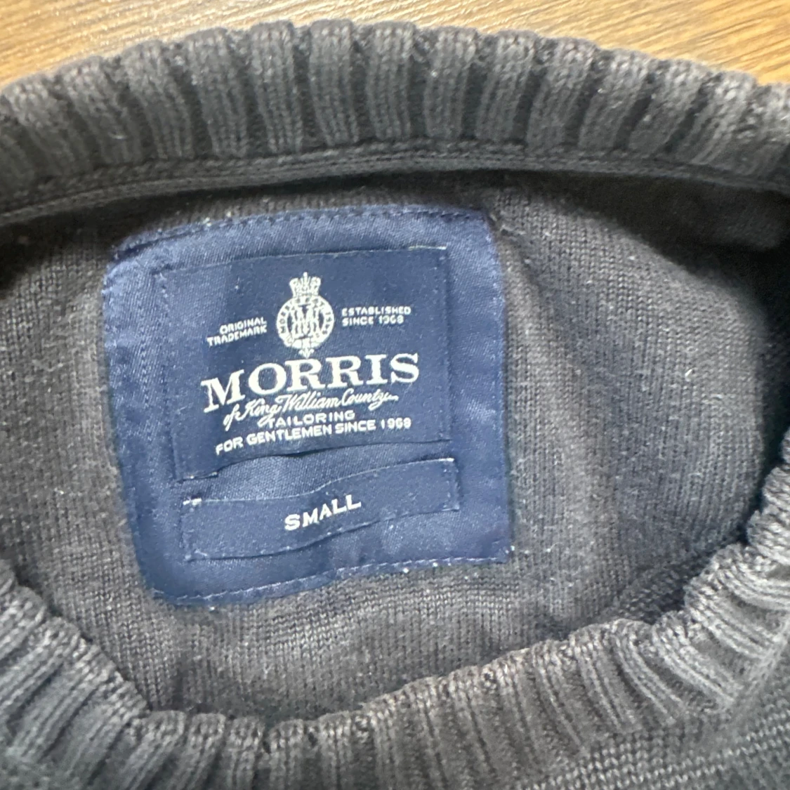 Svart stickad tröja från Morris i storlek Small. Tröjan har ett broderat Morris-emblem med brittisk flagga på bröstet och siffran 8 på vänster ärm. Rund hals och ribbade muddar vid ärmslut och nederkant. Perfekt för dig som gillar klassisk stil.