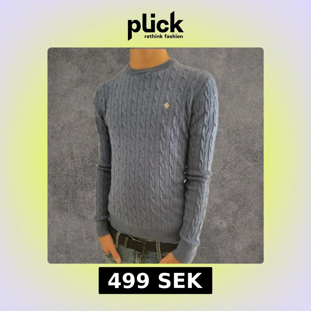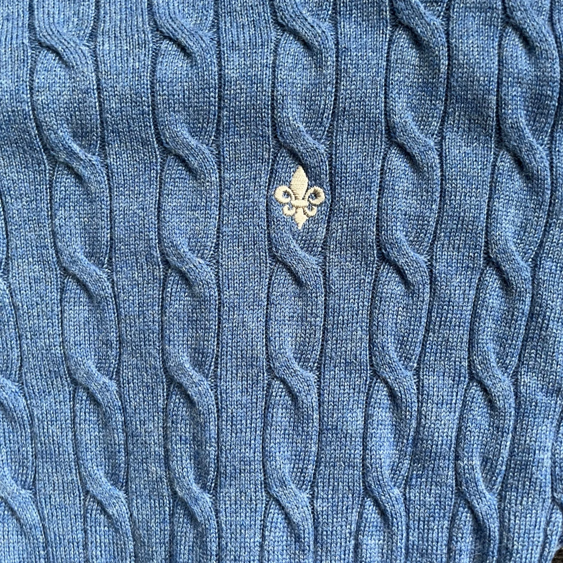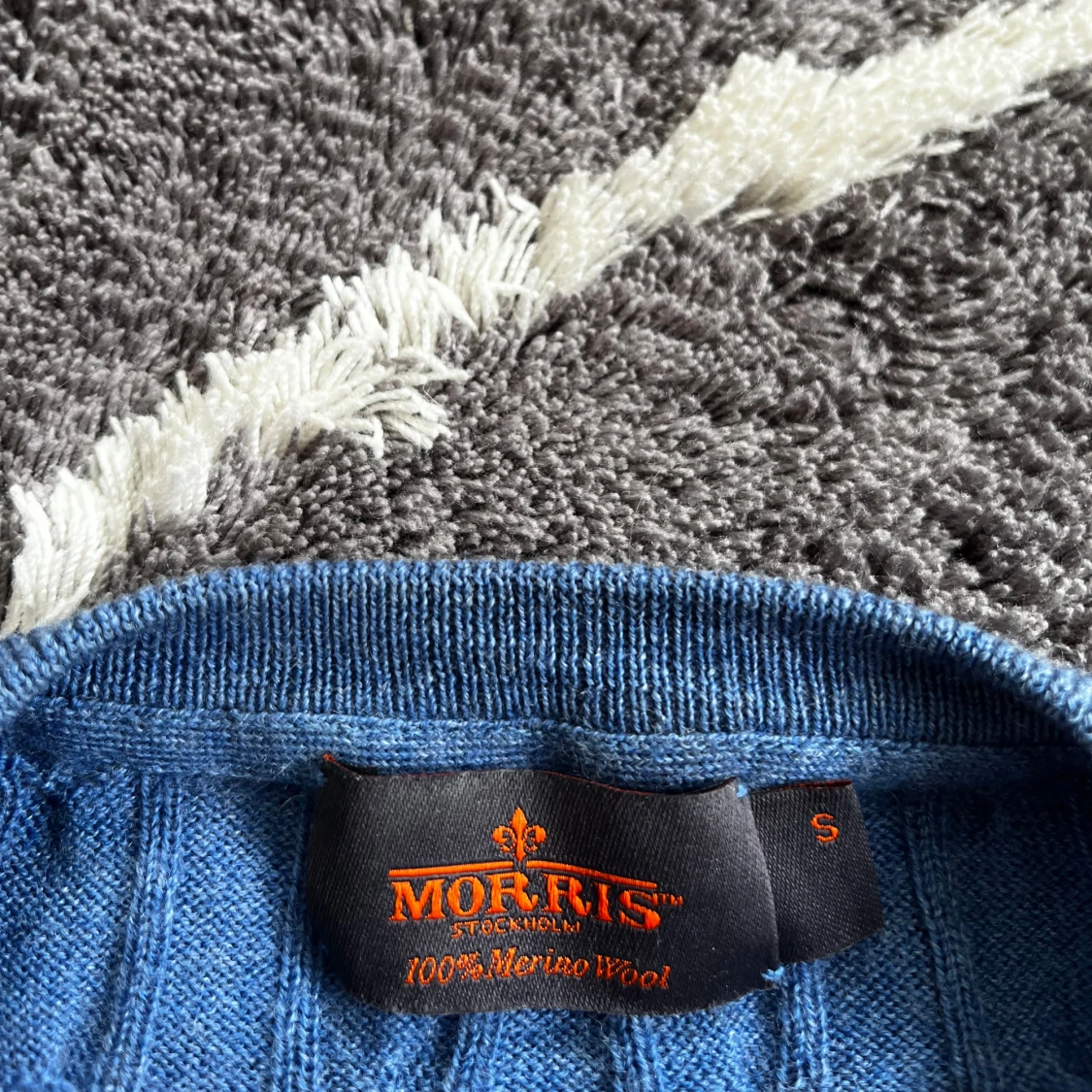 Snygg blå kabelstickad tröja från Morris i 100% merinoull. Tröjan har rund hals, lång ärm och en liten broderad logga på bröstet. Perfekt för dig som gillar klassisk stil med modern touch.