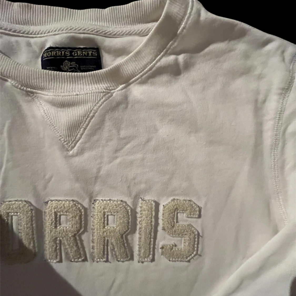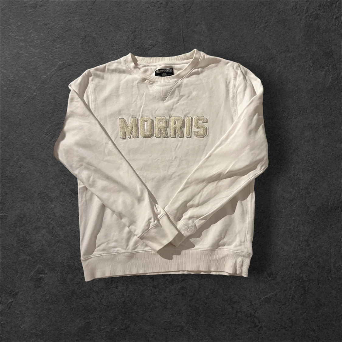 Vit sweatshirt från Morris med broderad logga framtill i offwhite. Klassisk rund halsringning, ribbade muddar och lång ärm. Skön och stilren tröja i bomull som passar perfekt till jeans eller chinos.