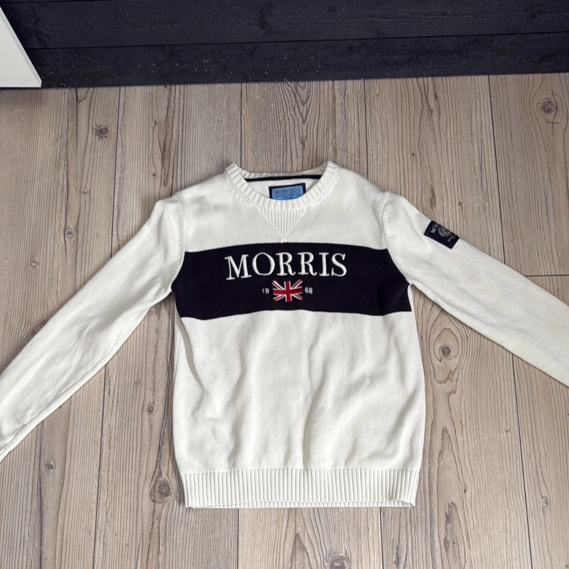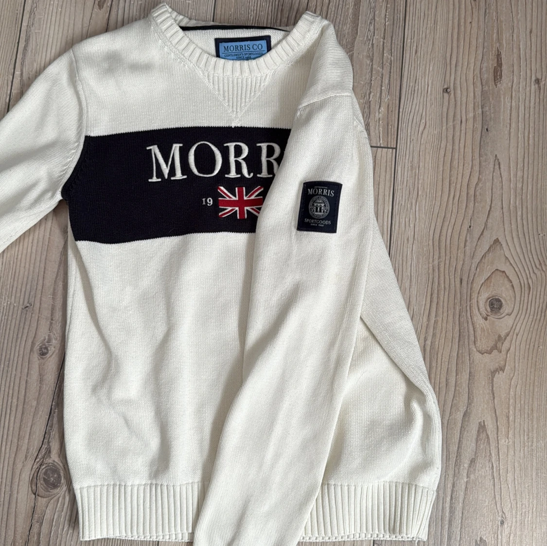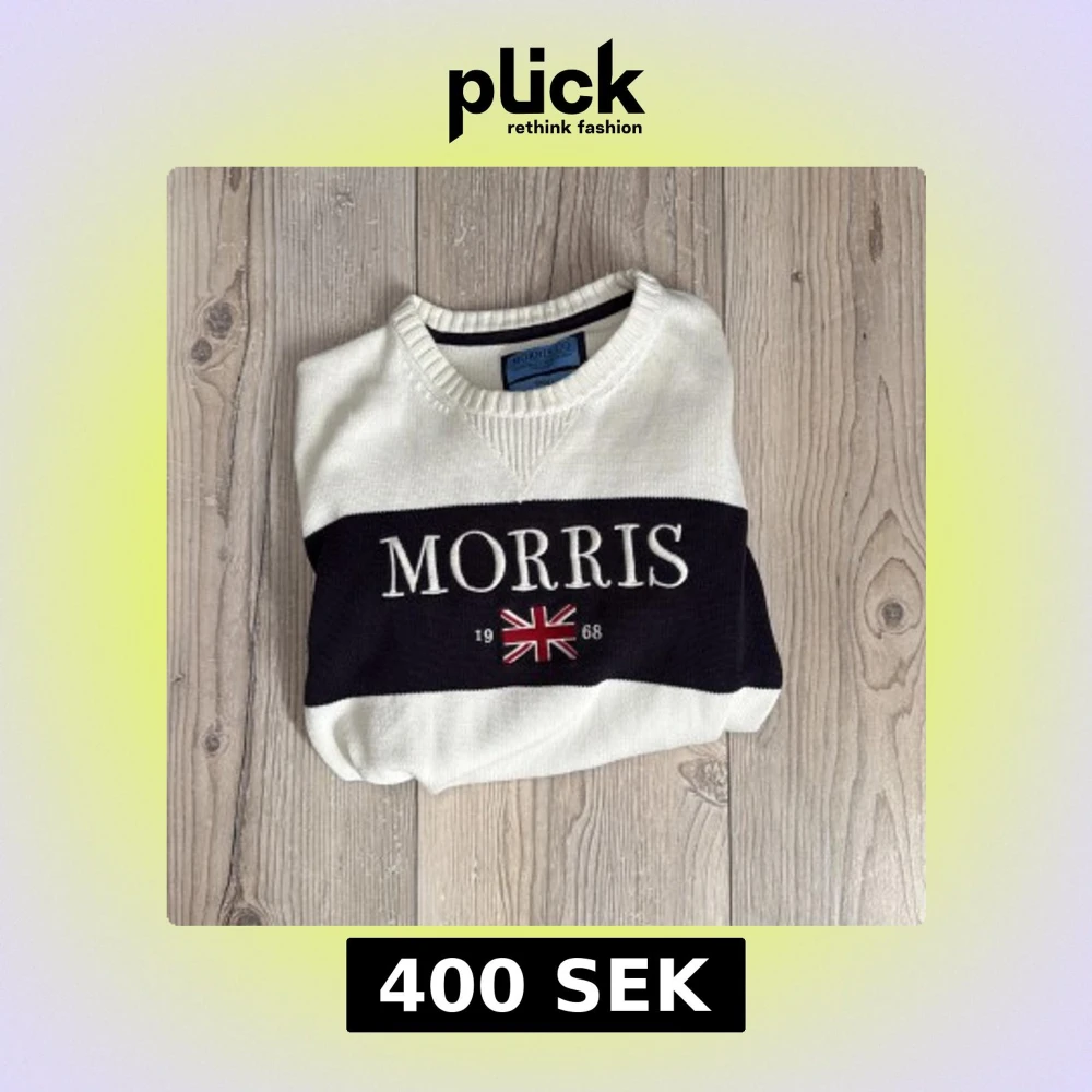 Säljer en stilren vit tröja från Morris med blå och broderad logga samt brittisk flagga framtill. Tröjan har ribbade muddar vid ärmslut och nederkant. Perfekt för en nice look och perfekt till Våren. Kan gå ner i pris vid snabb affär!