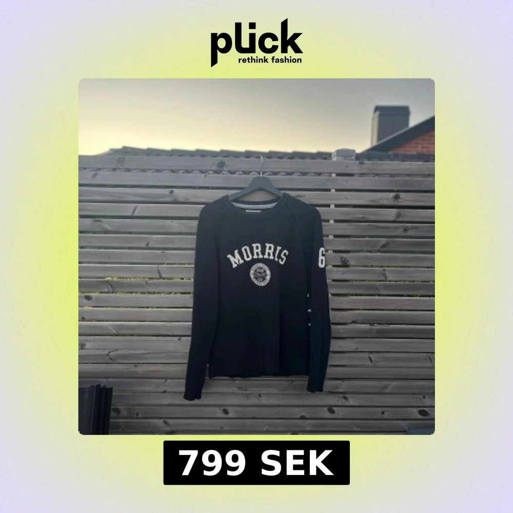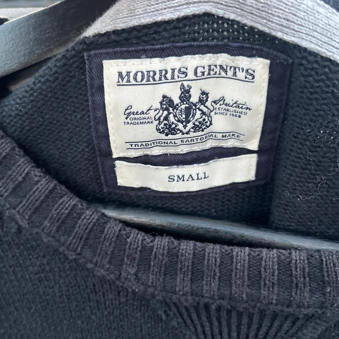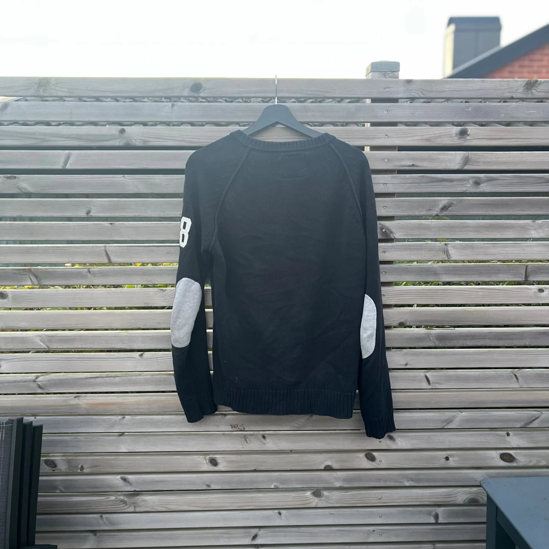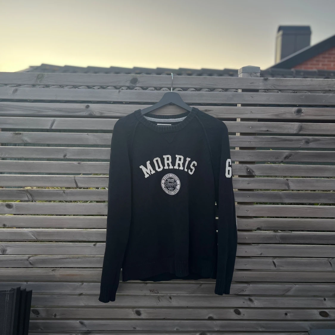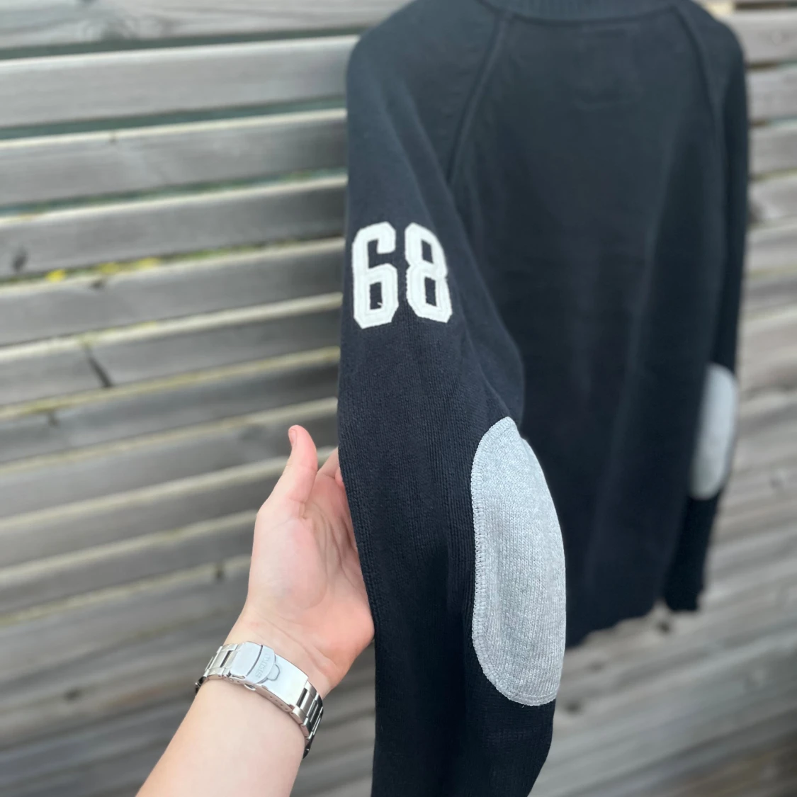 Navy färgad stickad tröja från Morris med vitt tryck på bröstet och siffran 68 på ena ärmen. Gråa förstärkningar på armbågarna och ribbade muddar. Perfekt unikt plagg för hösten! Skriv vid eventuella frågor!