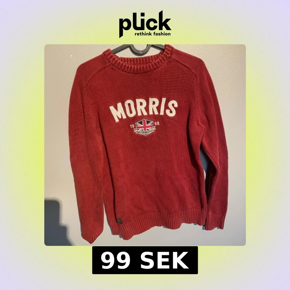 Säljer en snygg röd stickad tröja från Morris med broderad text och brittisk flagga på framsidan. Tröjan har långa ärmar och ribbad krage samt muddar. Perfekt för kyligare dagar!