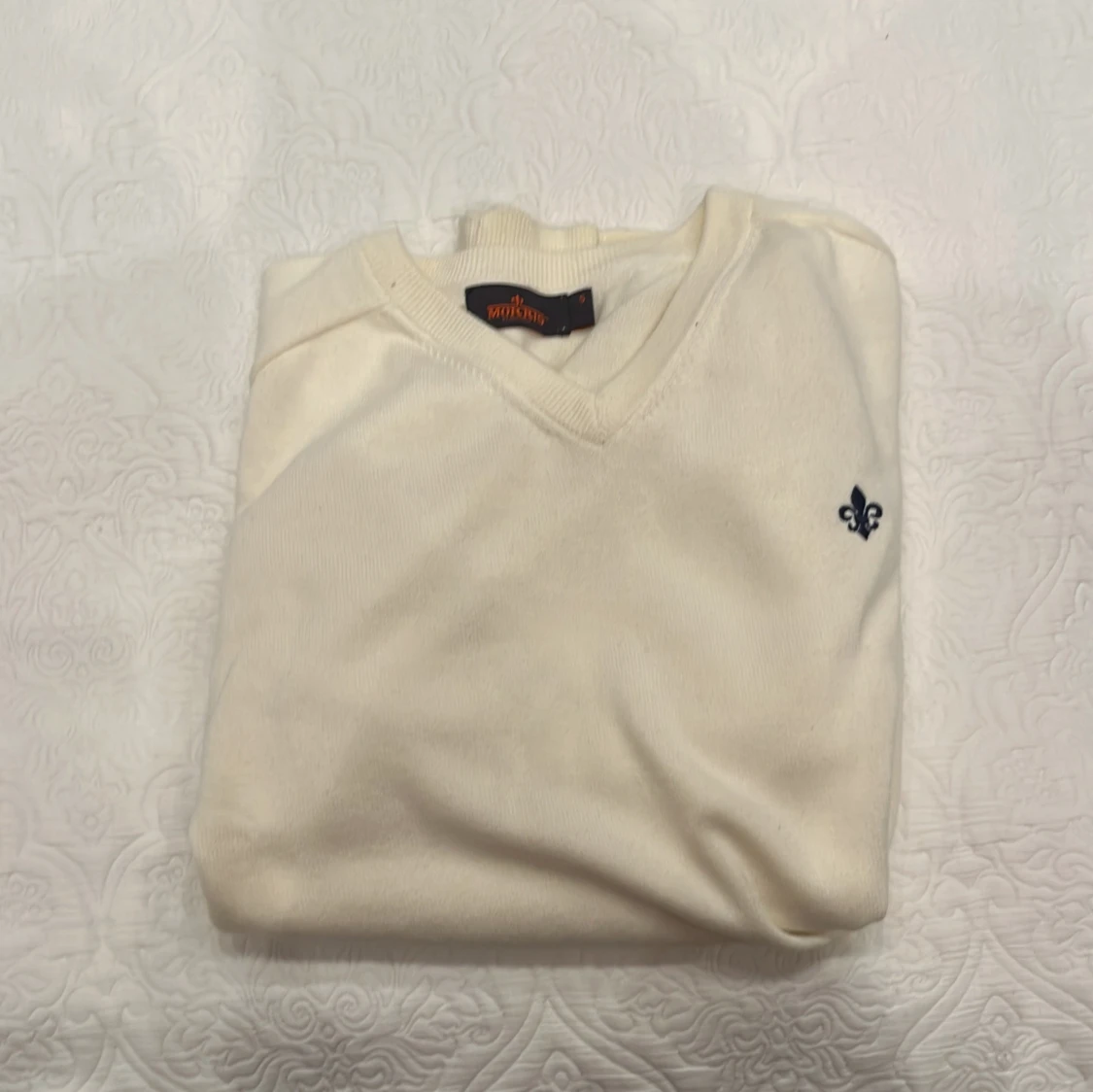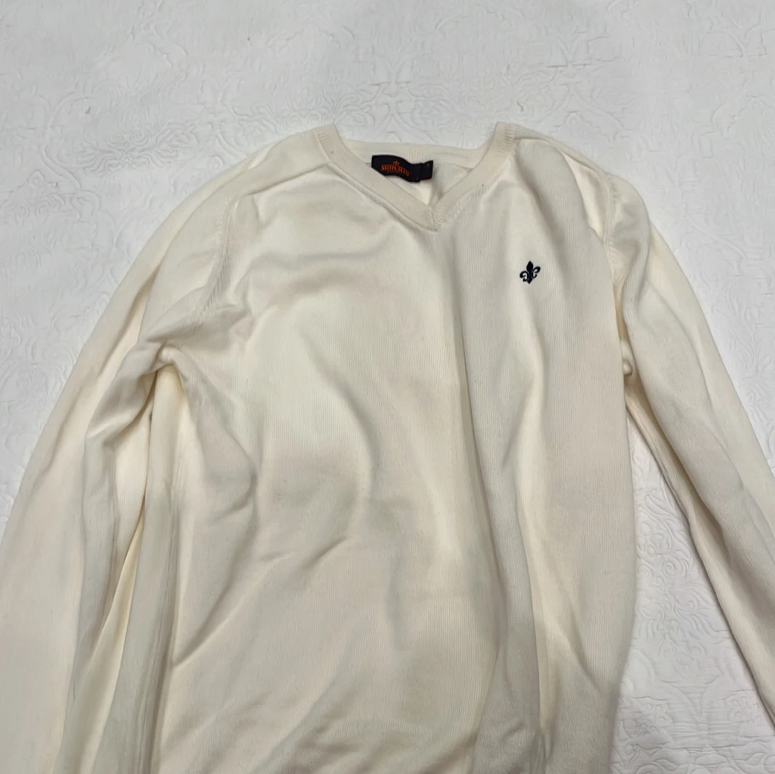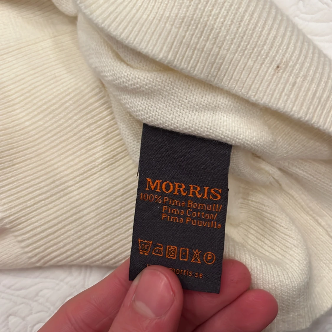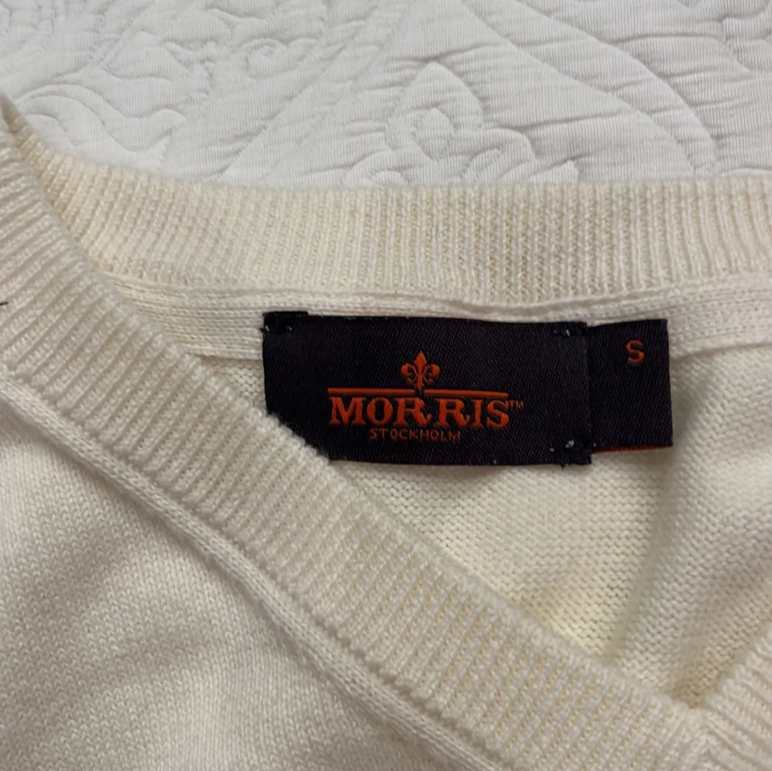 Säljer en stilren vit tröja från Morris i 100% Pima bomull. Tröjan har en v-ringad design och ett diskret broderat emblem på bröstet. Perfekt för en klassisk och elegant look.
