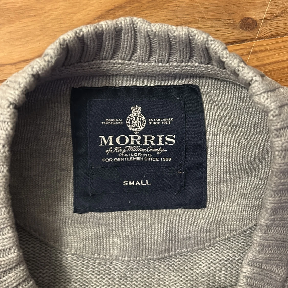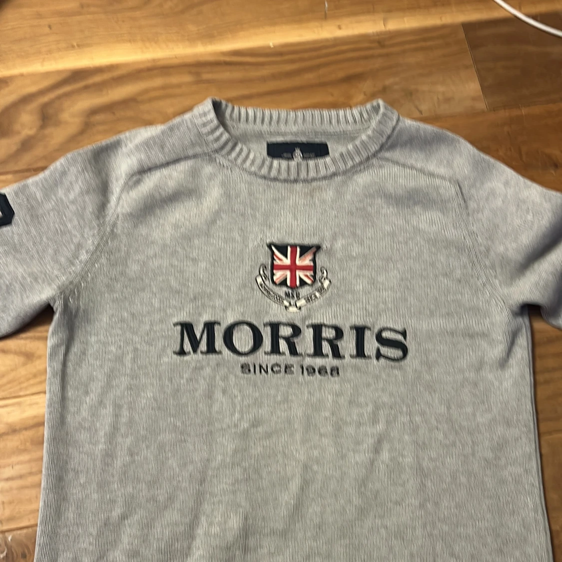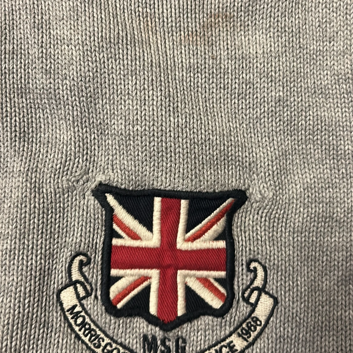 Snygg grå stickad tröja från Morris med broderad brittisk flagga och text på bröstet. Tröjan har ribbade muddar, rund hals och svart 68-tryck på ena ärmen. Perfekt för dig som gillar klassisk och sportig stil. Har dock två små defekter på loggan men de syns inte om man inte nämner det