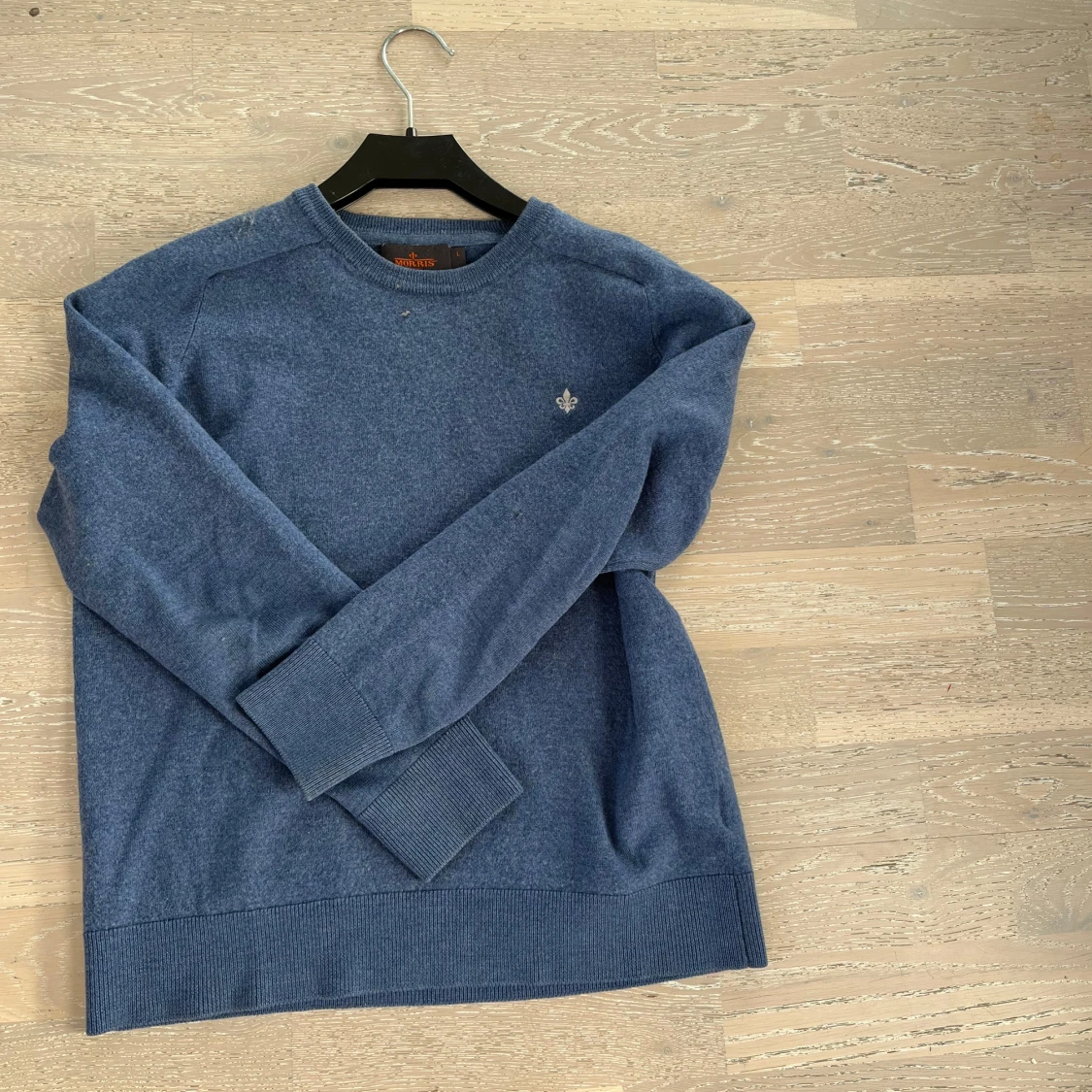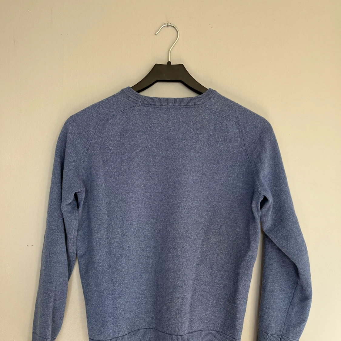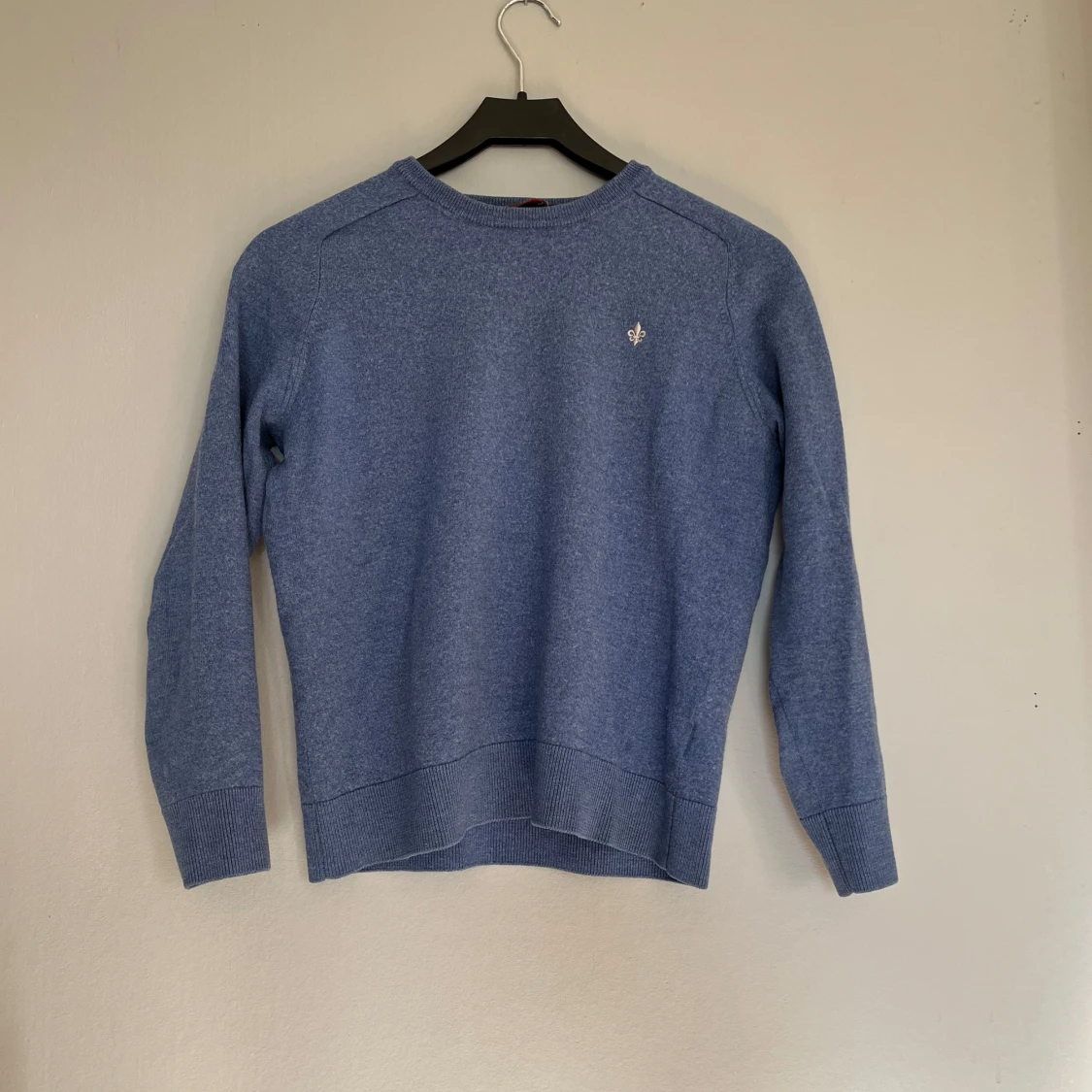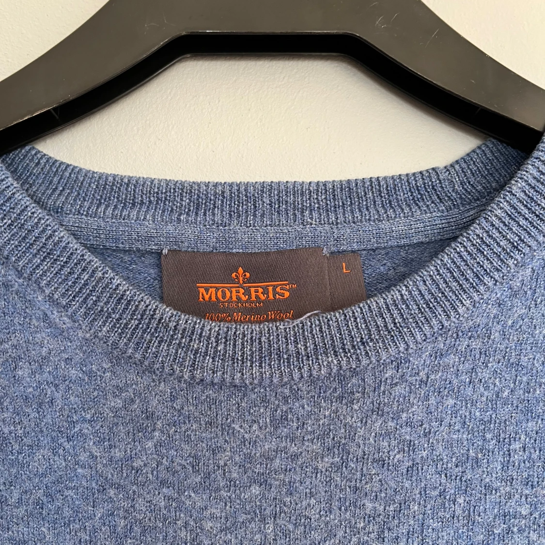 Säljer en stilren blå tröja från Morris. Det står storlek L men den har krympt så skulle säga om du är runt omkring 157cm så passar den. Den är av merinoull. Om det finns frågor är det bara att höra av er!🤩