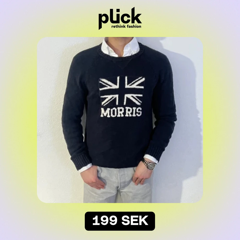 Morris stickad tröja, jättefin och felfri. Den är i storlek L. Nypris ca 1500kr Modellen är 180cm, väger 73 kg