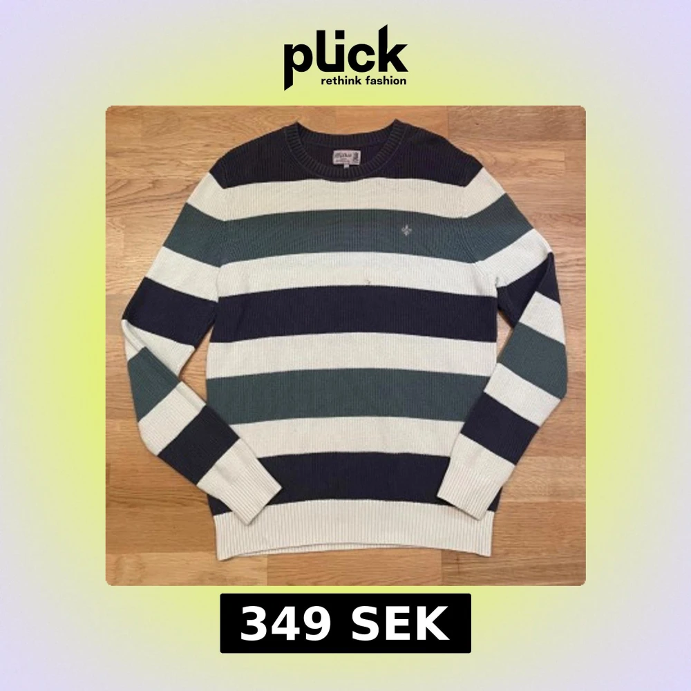 Snygg stickad tröja från Morris med breda ränder i mörkblått, grått och vitt. Tröjan har rund hals, långärmade ribbade muddar och en liten broderad logga på bröstet. Perfekt för dig som gillar klassisk stil med en modern twist. Gott skick men ett litet (jätte litet) hål!