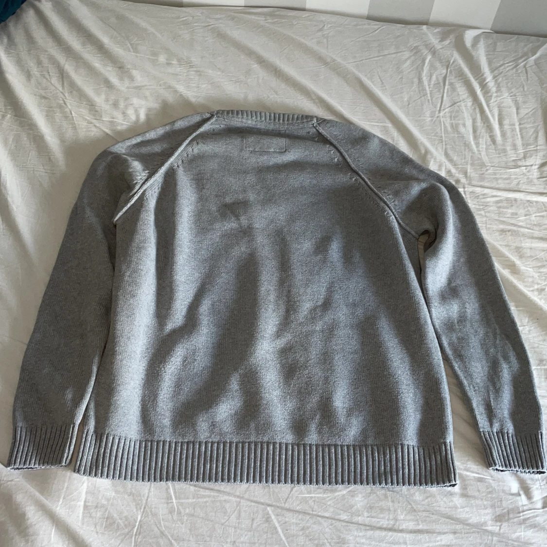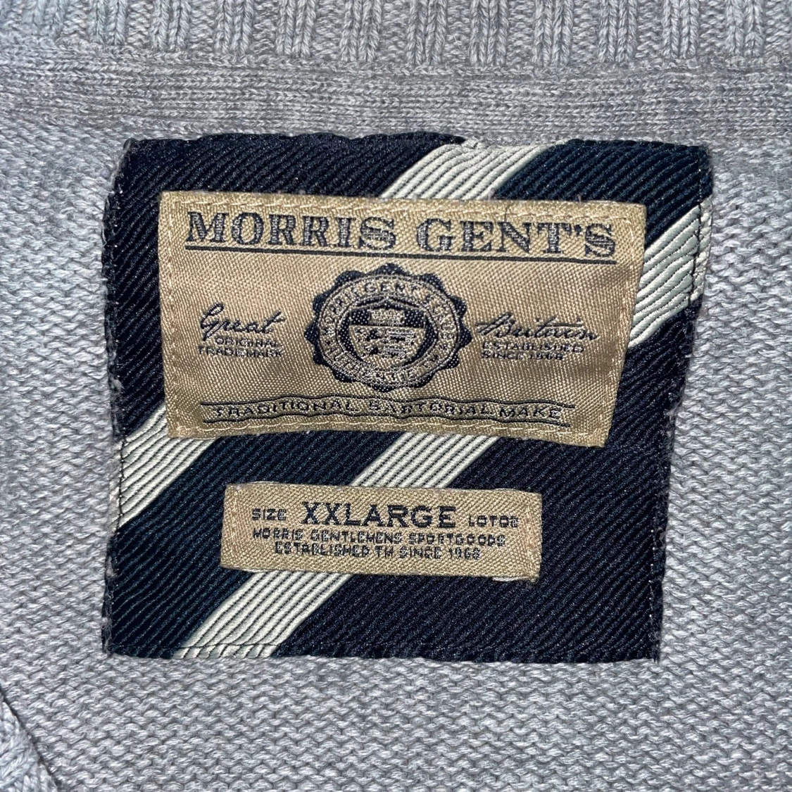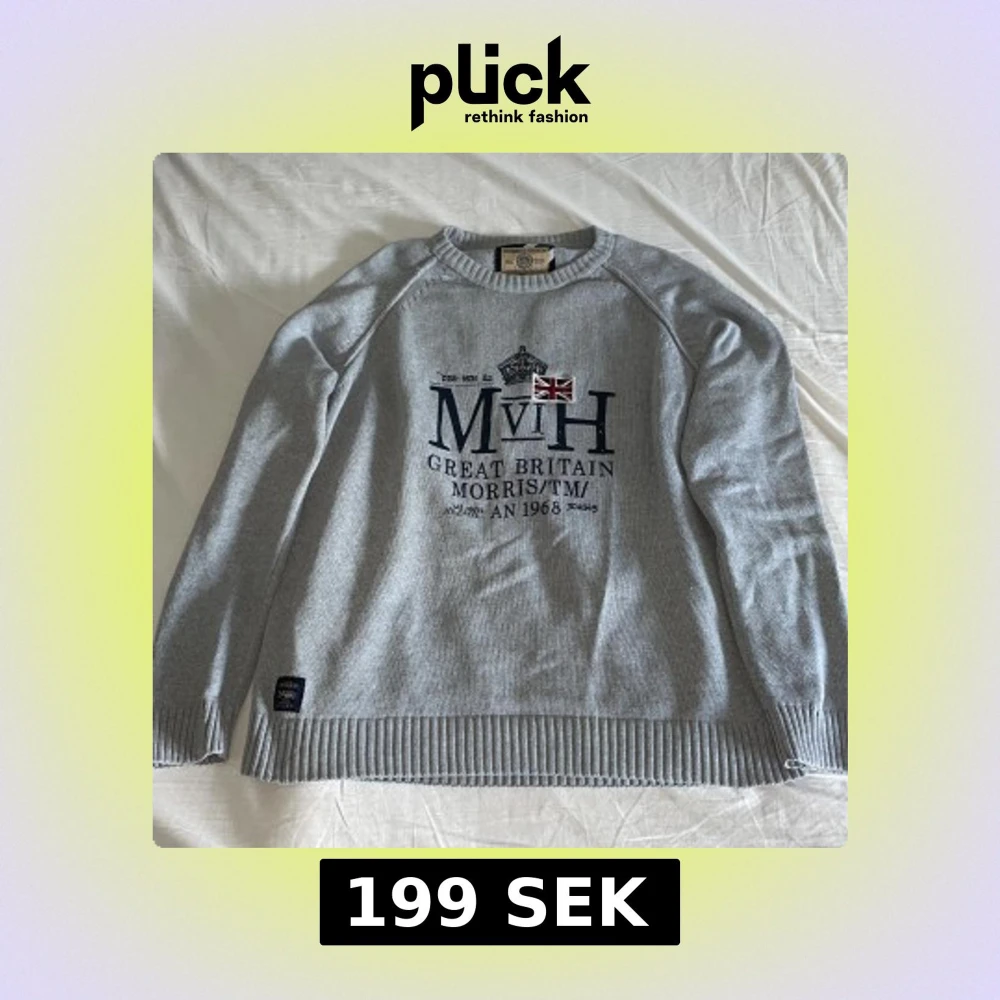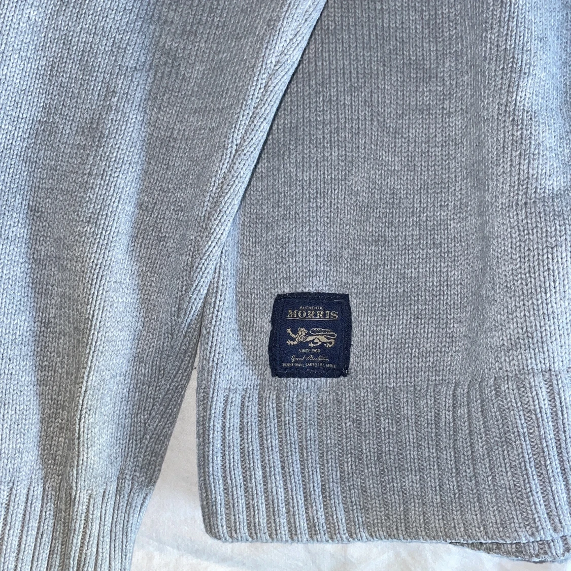 Snygg grå stickad tröja från Morris med broderad text och brittisk flagga framtill. Tröjan har ribbade muddar vid ärmslut och nederkant samt rund halsringning. Storlek XLL men passar L möjligen M