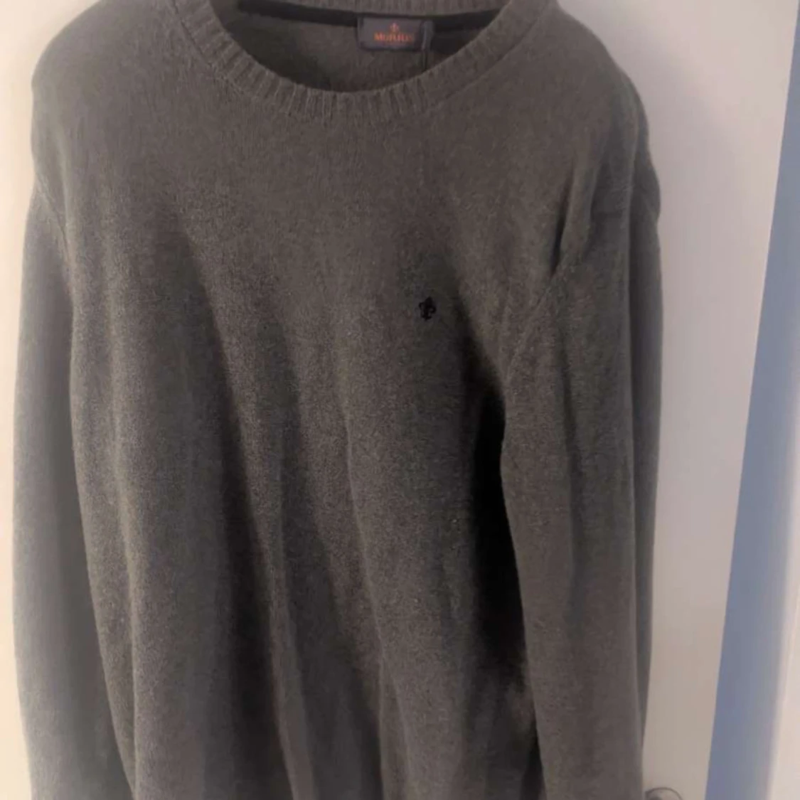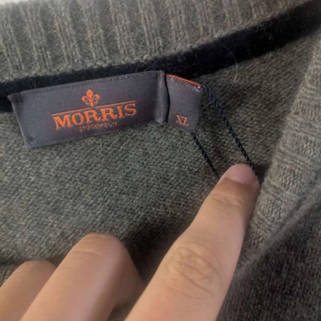 Mysig grå stickad tröja från Morris i storlek XL. Klassisk rund halsringning och diskret broderad logga på bröstet. Perfekt för lager-på-lager och passar till både jeans och chinos. Materialet är mjukt och värmande ull.