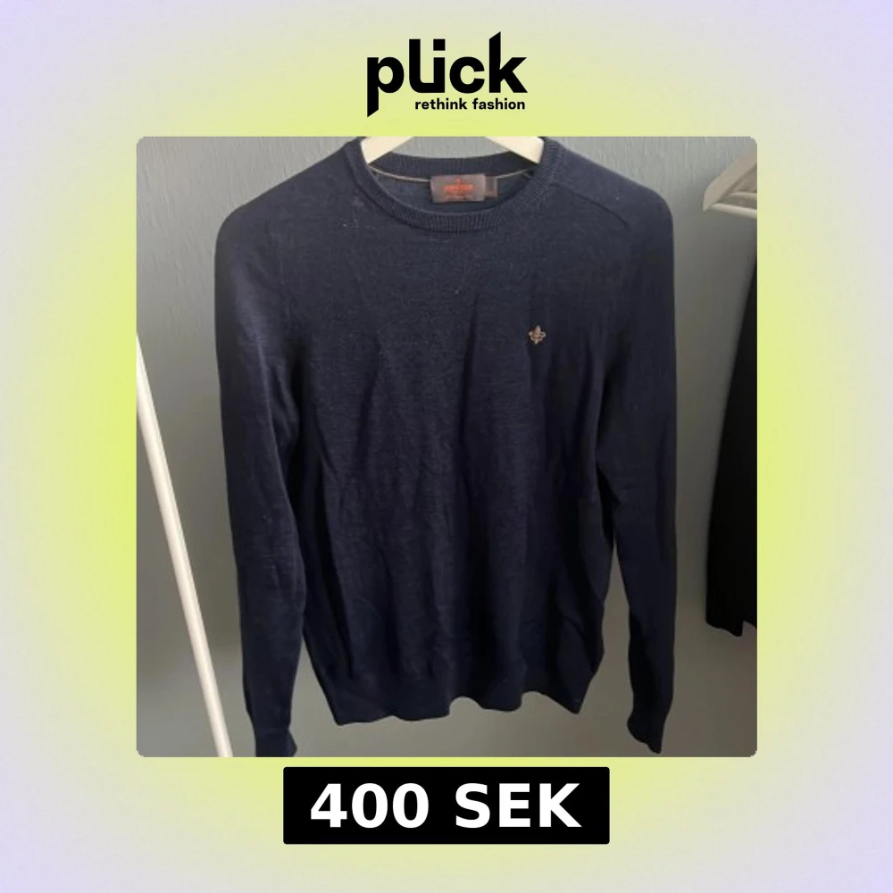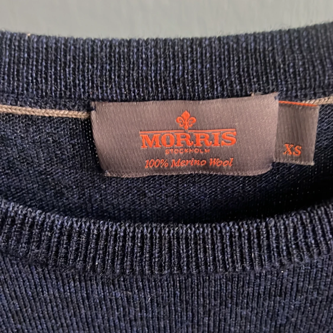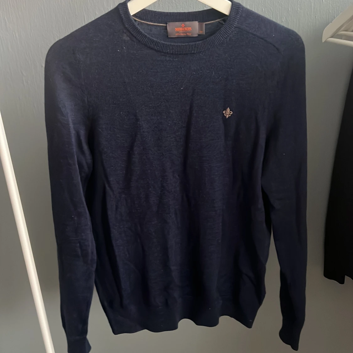 Snygg mörkblå stickad tröja från Morris i 100% merinoull. Klassisk rund halsringning och diskret logga broderad på bröstet. Perfekt för dig som gillar stilrena och bekväma plagg med premiumkänsla.