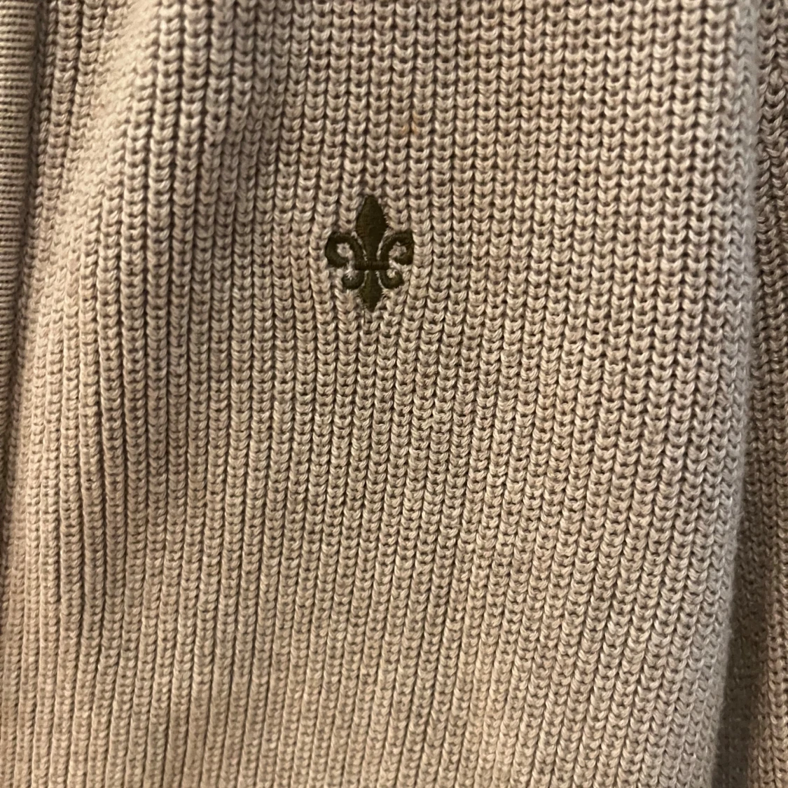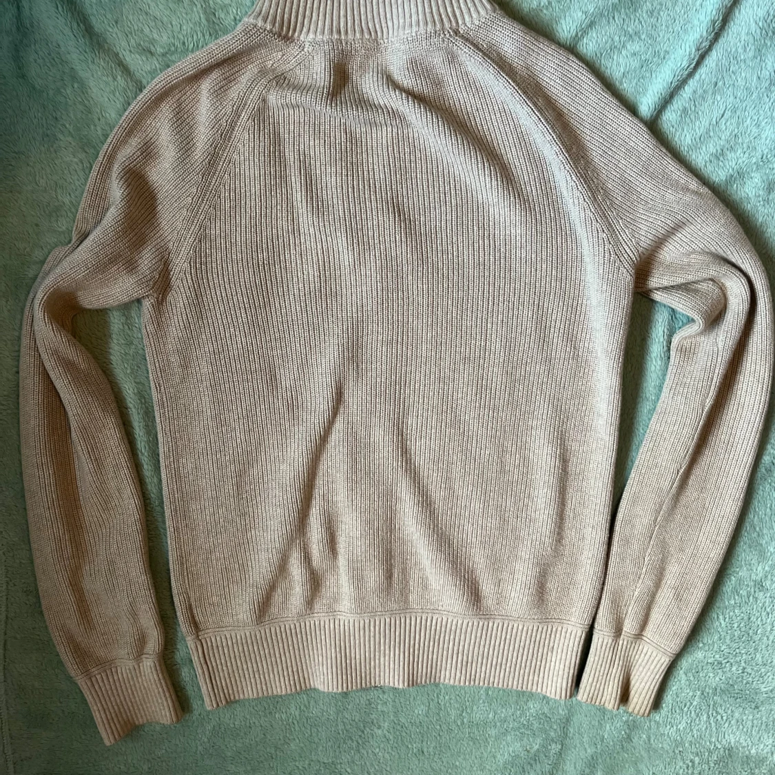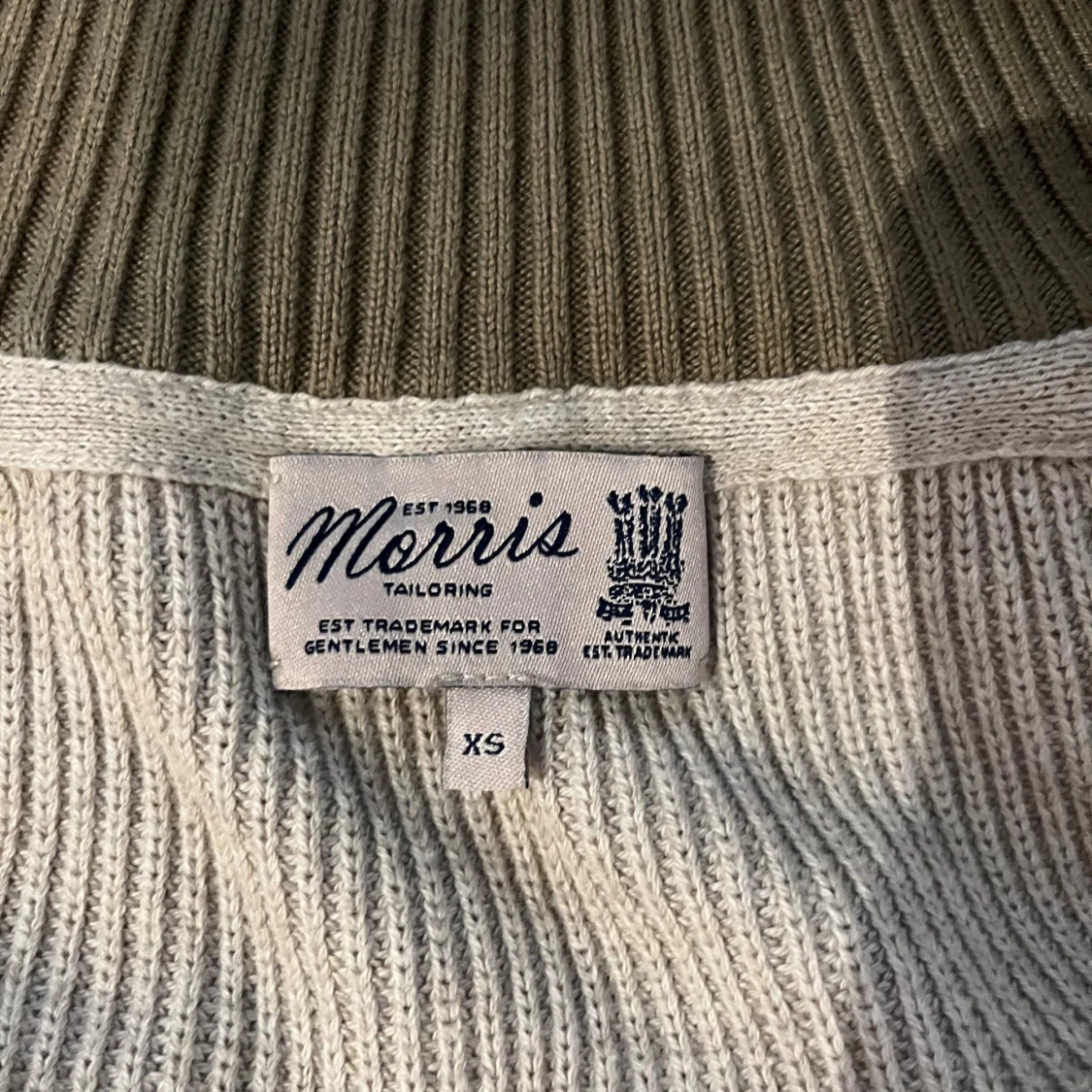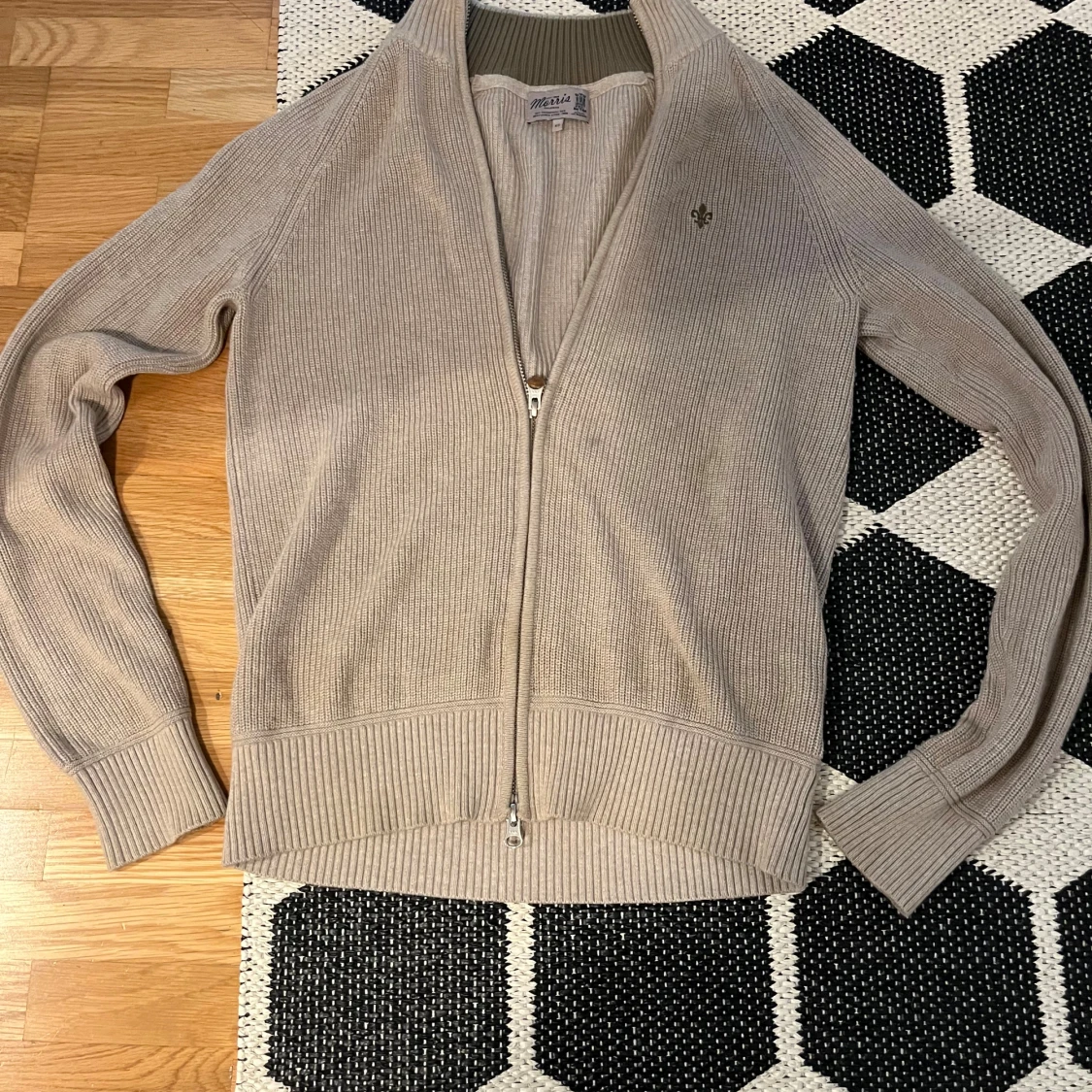 Ribbstickad beige kofta från Morris i storlek XS. Koftan har hel dragkedja framtill, hög krage och diskret broderad logga på bröstet. Perfekt för lager-på-lager och snygg till jeans eller kjol.