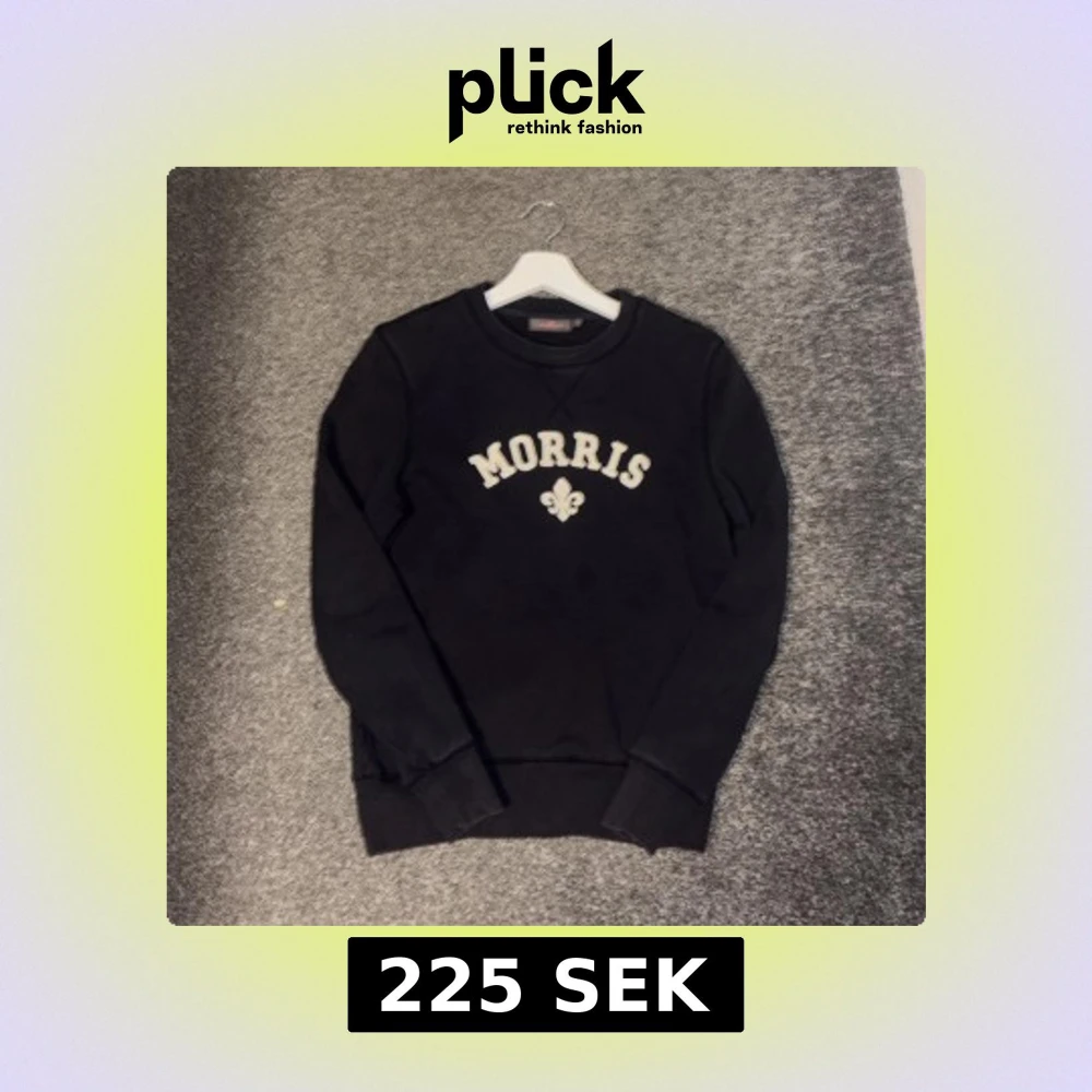 Svart sweatshirt från Morris i storlek XS med vit text och emblem på bröstet. Tröjan har rund hals, långa ärmar och ribbade muddar vid ärmslut och nederkant. Perfekt för dig som gillar klassisk och enkel stil.