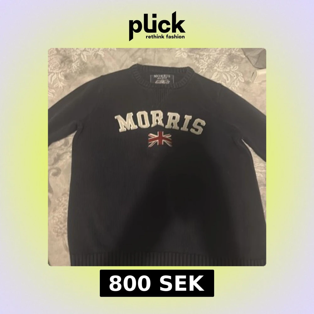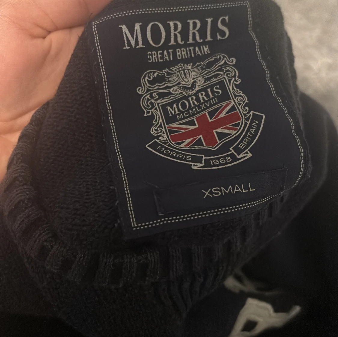 Mörkblå tröja från Morris i storlek XS med broderad logga och brittisk flagga på bröstet. Klassisk rund halsringning och ribbade muddar. Perfekt för dig som gillar preppy stil och snygga detaljer.