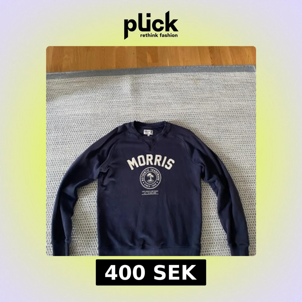 Säljer en mörkblå sweatshirt från Morris med vit logga och tryck framtill. Tröjan har rund halsringning, långa ärmar och ribbade muddar vid ärmslut och nederkant. Perfekt för en avslappnad och sportig stil.