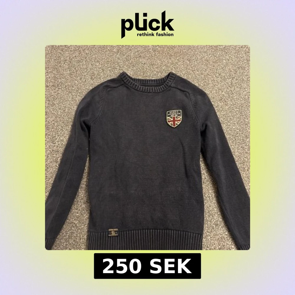 Snygg mörkblå stickad tröja från Morris Gents i storlek XS. Tröjan har ett broderat märke med brittisk flagga på bröstet och ribbade muddar vid hals, ärmslut och nederkant. Perfekt för dig som gillar klassisk och stilren look.