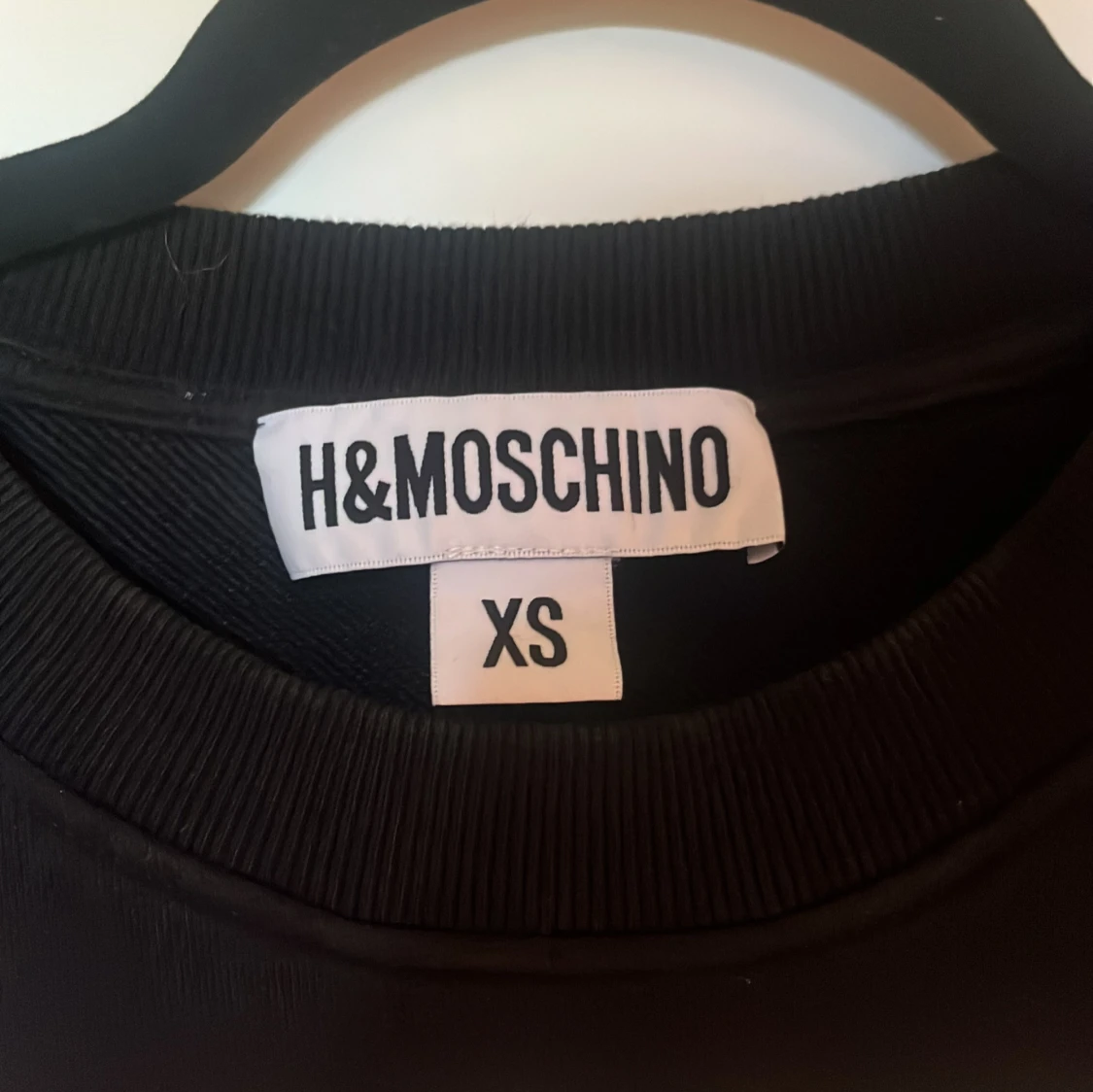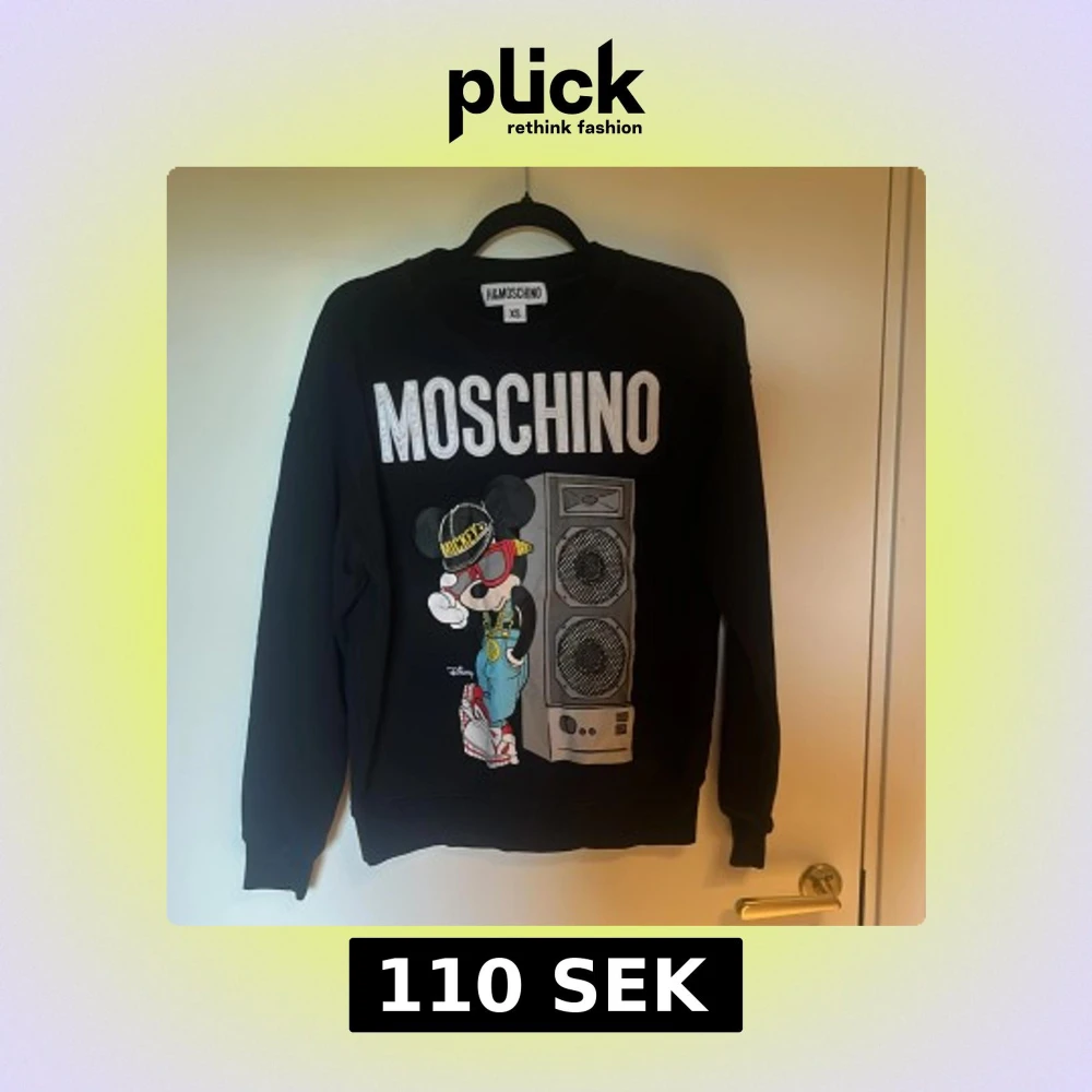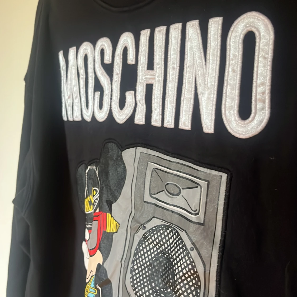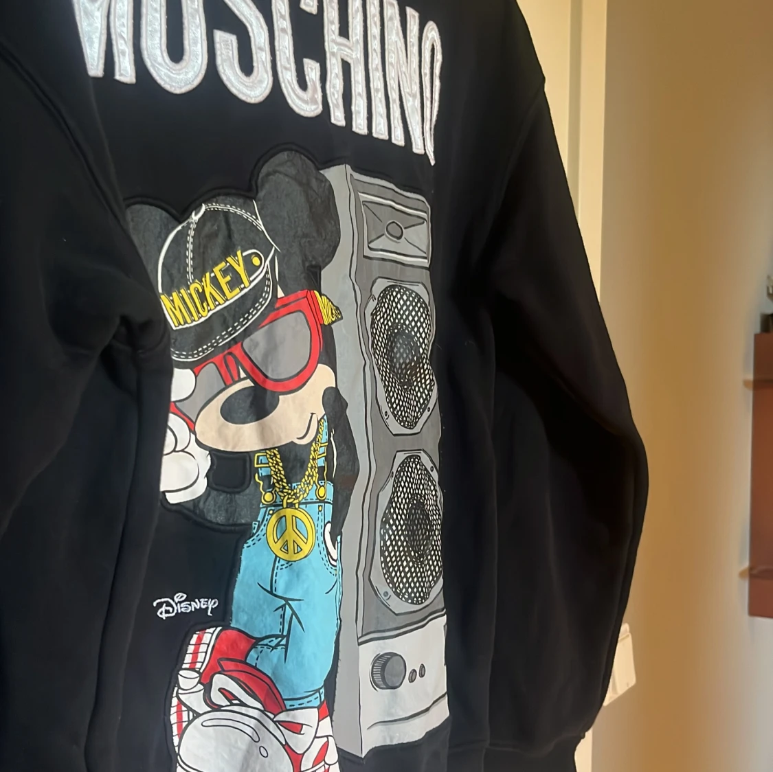 Cool svart tröja från Moschino x H&M i storlek XS med stort tryck av Mickey Mouse i streetstyle och högtalare på framsidan. MOSCHINO-loggan i silver upptill. Långärmad och i mjuk bomull, perfekt för dig som gillar statement-plagg. Priset är inte hugget i sten, vid snabb affär kan jag halvera priset