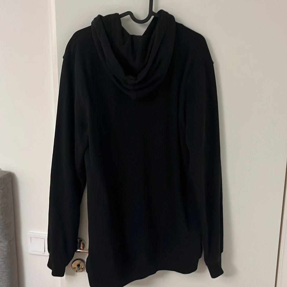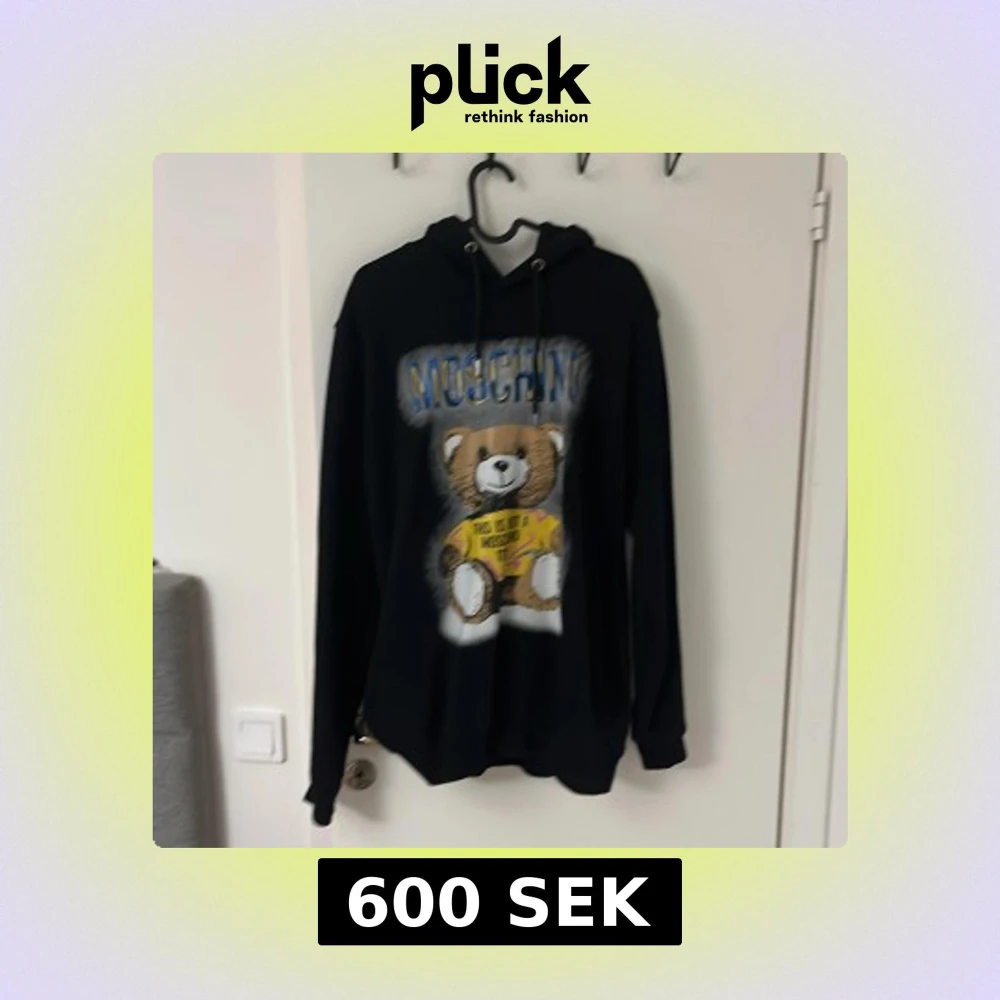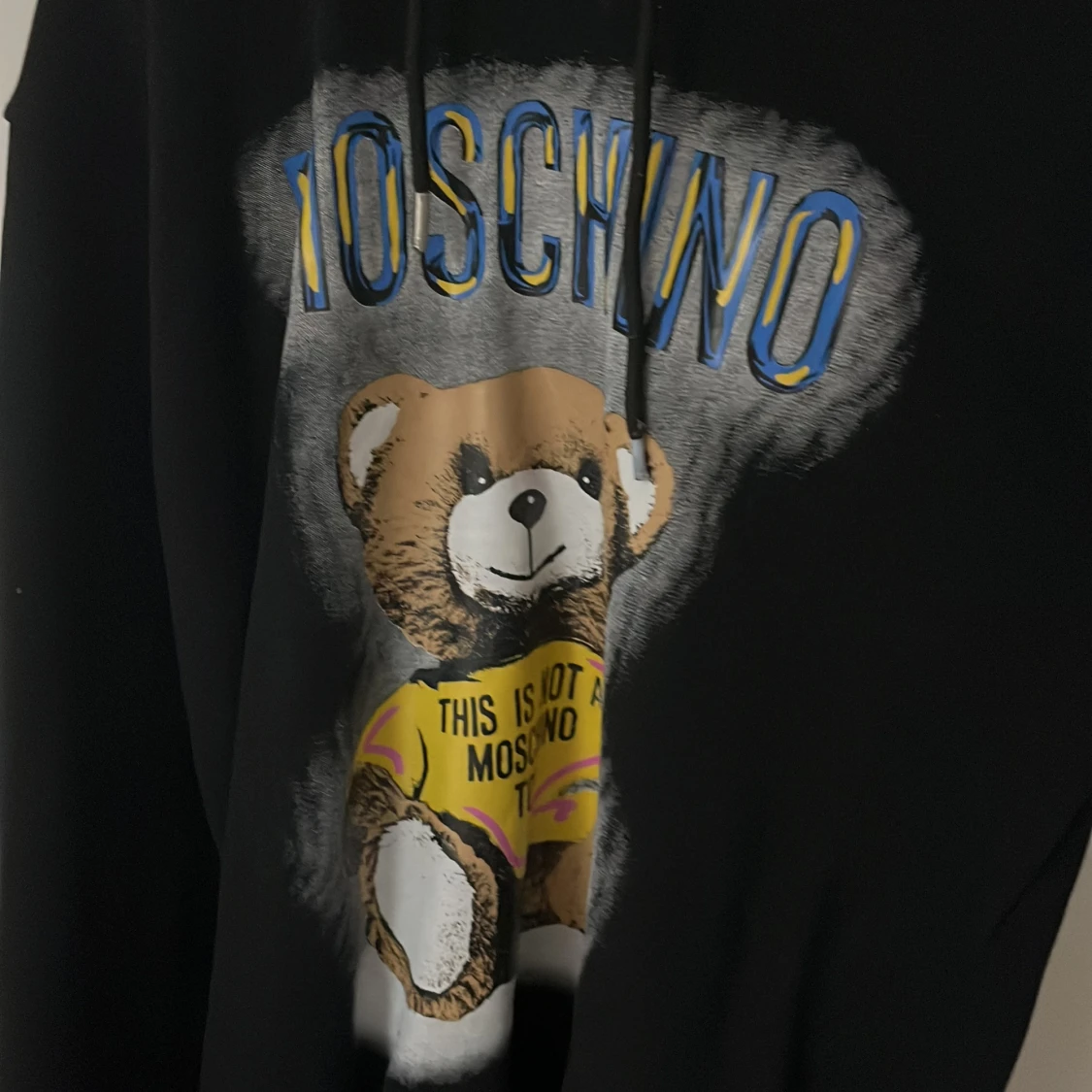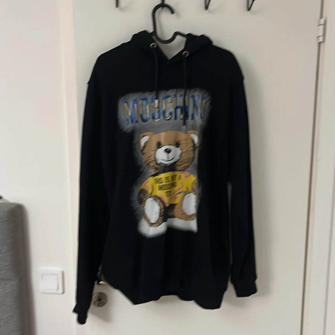 Svart hoodie från Moschino i storlek L med ett stort tryck av en nalle på framsidan och Moschino-loggan i blått och gult. Tröjan har huva med snörning och långa ärmar. Perfekt för dig som gillar statement-plagg och coola designer.