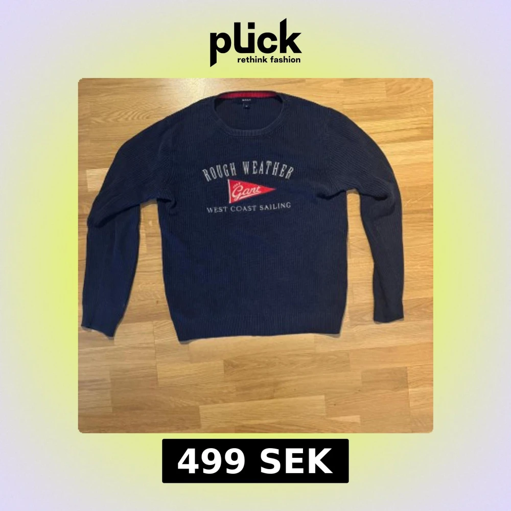 Säljer en marinblå stickad tröja från Gant med broderad text och röd flaggdetalj framtill. Tröjan har rund halsringning och långa ärmar, perfekt för dig som gillar klassisk och sportig stil.