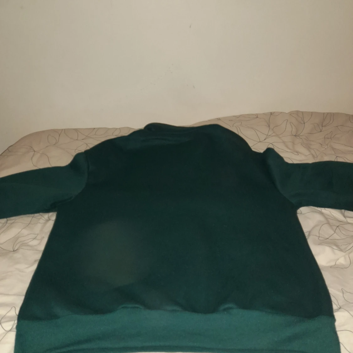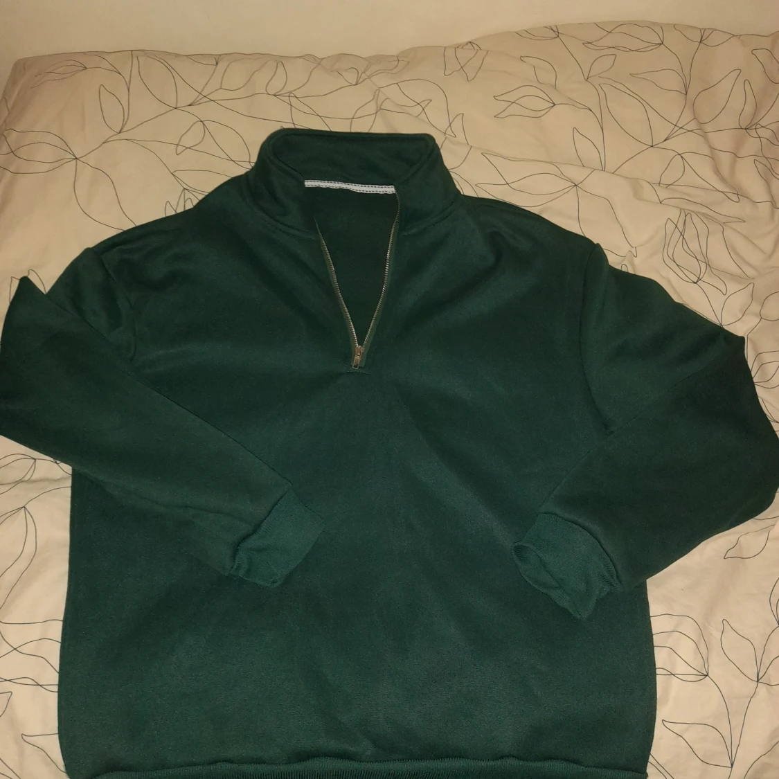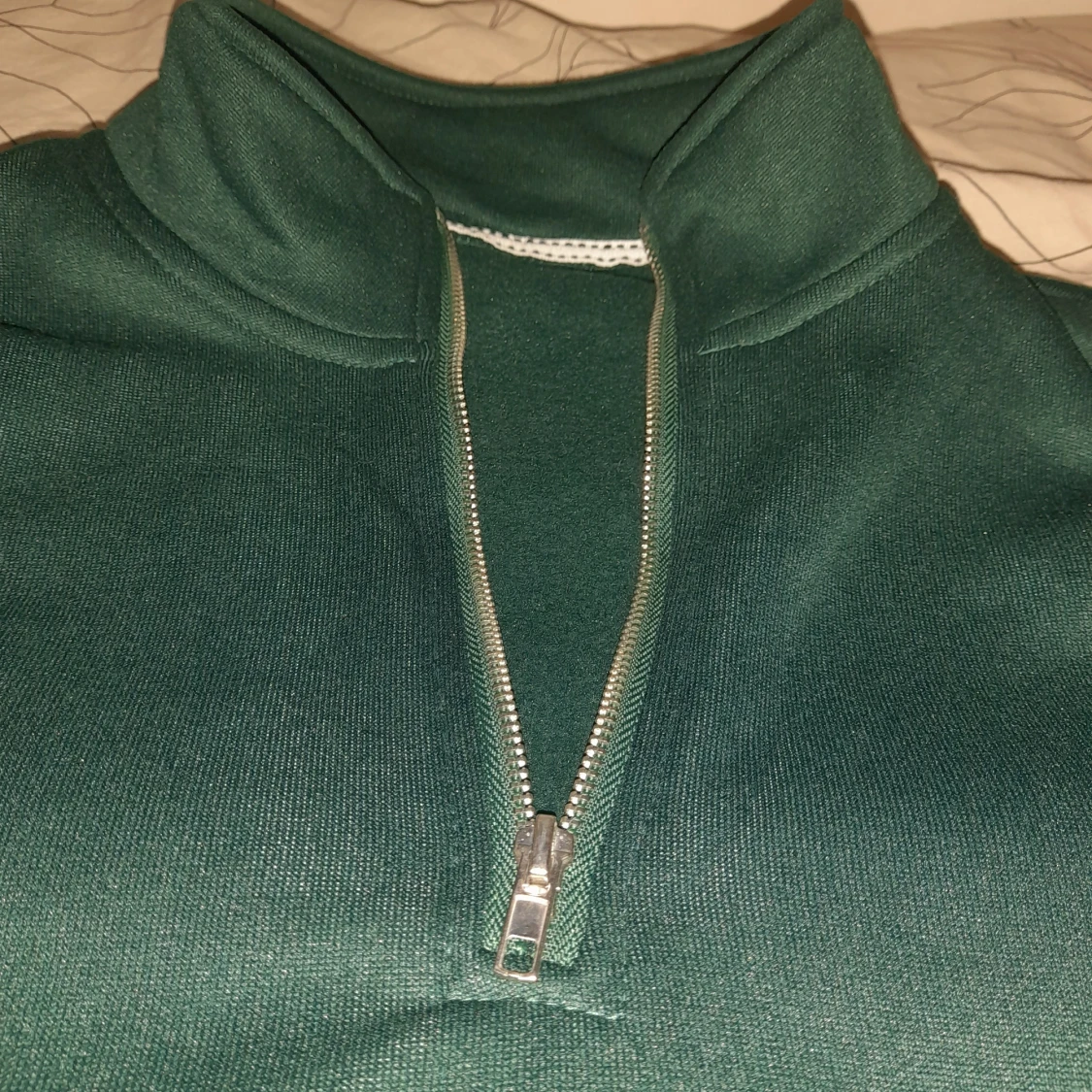 Säljer en grön tröja med halv dragkedja och hög krage. Tröjan har långa ärmar och är perfekt för kyligare dagar. Den är stilren och enkel att matcha med olika outfits.