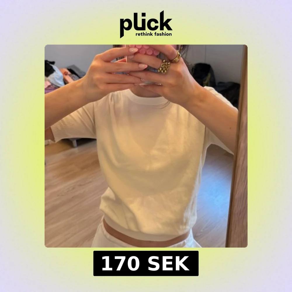 Lite tjockare krämvit, enkel och stilren kortärmad tröja från Zara. Tröjan har rund halsringning, ribbade muddar vid ärmslut och midja. Storlek M men liten i storleken