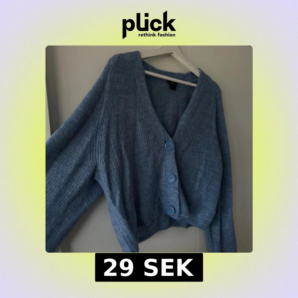Mysig blå croppad kofta från Lindex med stora knappar framtill. Den har en v-ringad design och är perfekt för kyligare dagar. Koftan är stickad och har en avslappnad passform. Använd 1-3 gånger 🩵🫐❄️