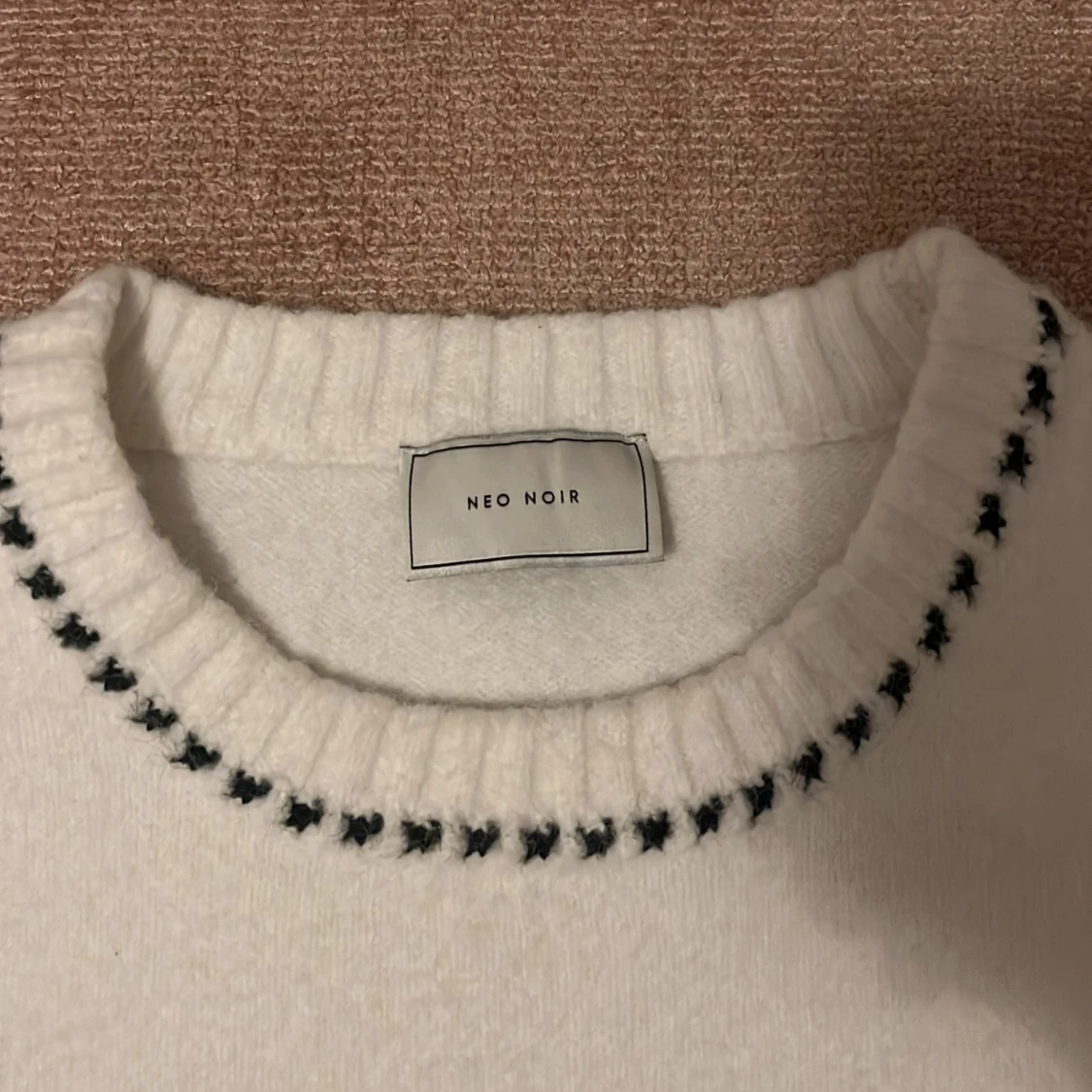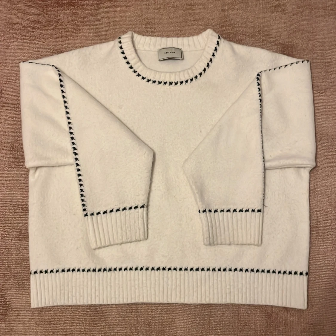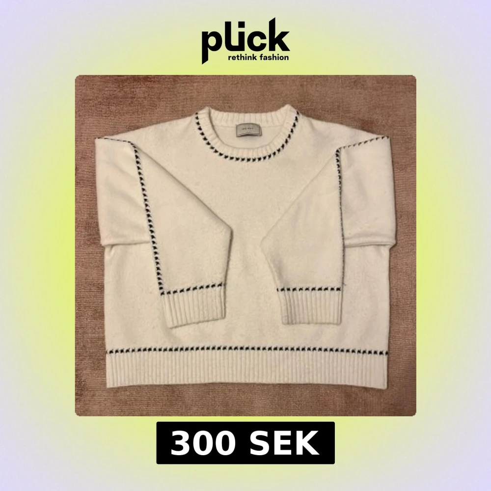 Säljer en vit stickad tröja från Neo Noir med svarta dekorativa sömmar längs halsringning, ärmar och nederkant. Tröjan har rund hals och långa ärmar med ribbade muddar. Använd 1 gång! Nypris ca 600