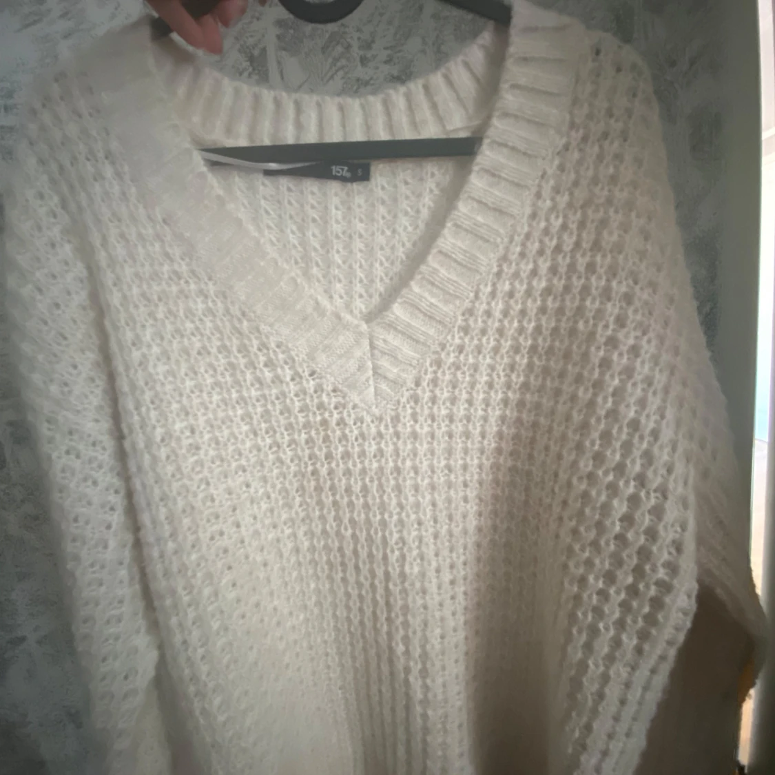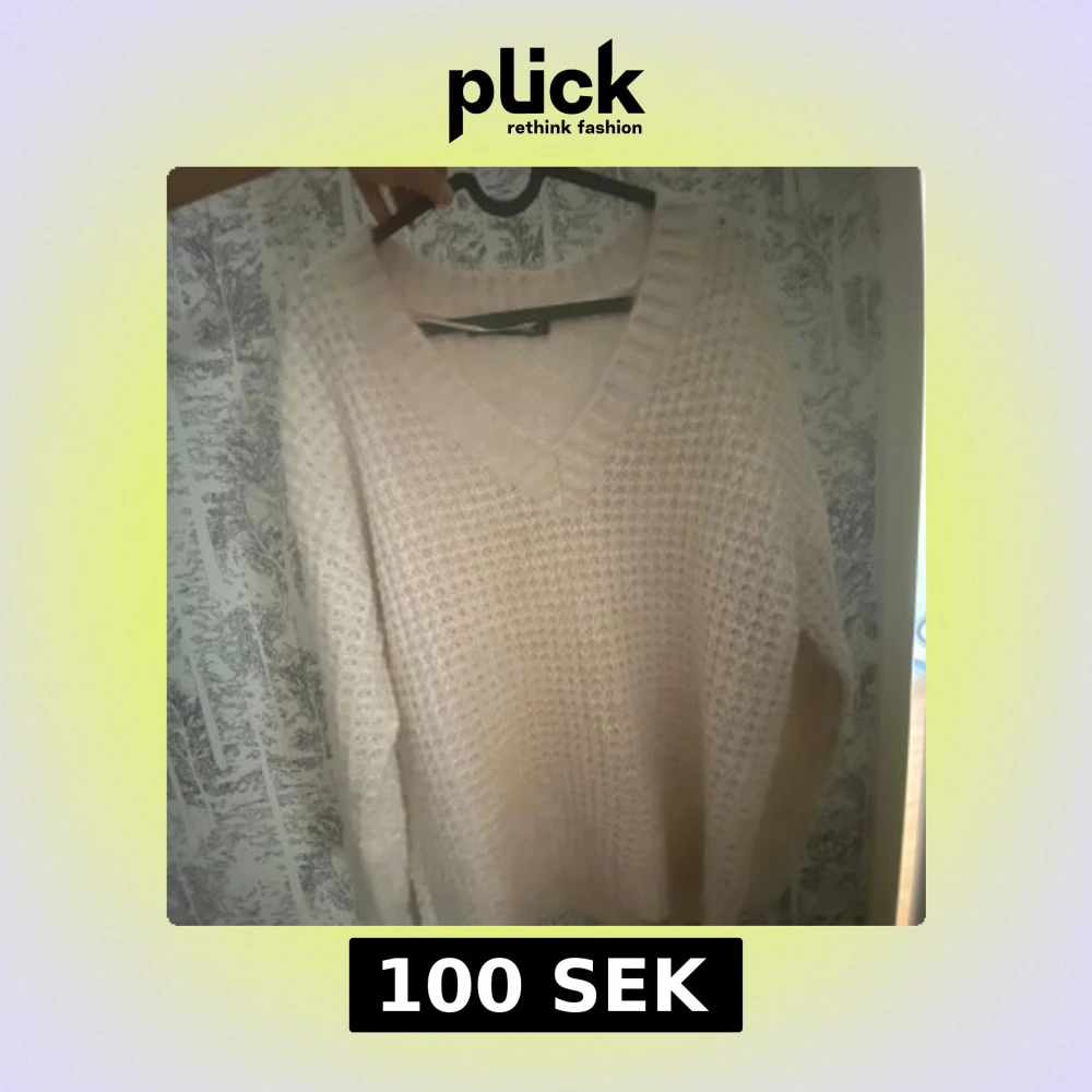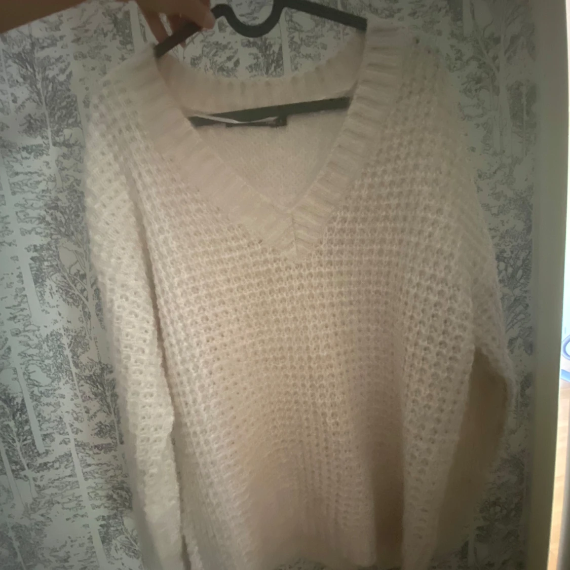 Mysig vit stickad tröja med v-ringning och grovstickat mönster. Perfekt för kyliga dagar och enkel att matcha med olika outfits. Långa ärmar och avslappnad passform.