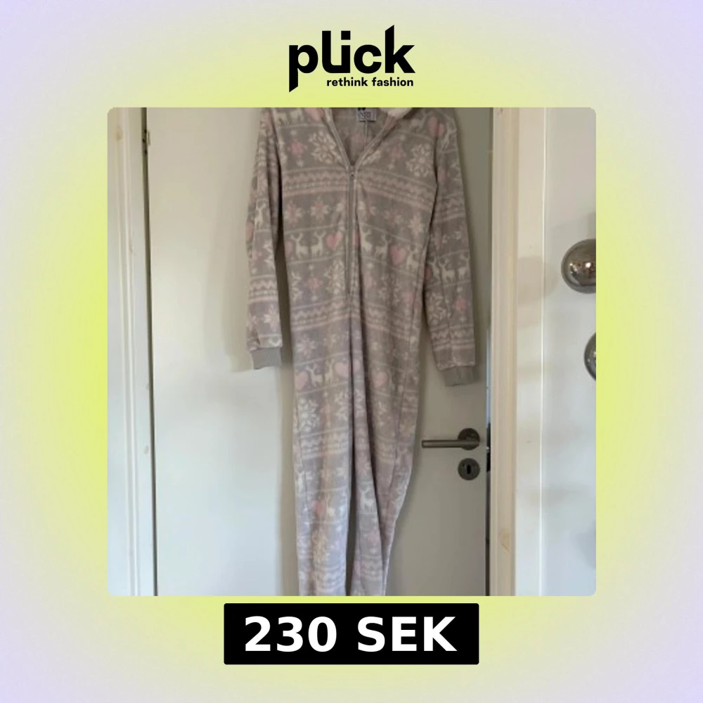 Supermjuk och varm onesie i ljusgrå fleece med vita och rosa vintermönster, hjärtan och renar. Har huva med fluffigt foder, dragkedja framtill och långa ärmar med muddar. Perfekt för kalla dagar när du vill chilla hemma. Aldrig använd. Strl S