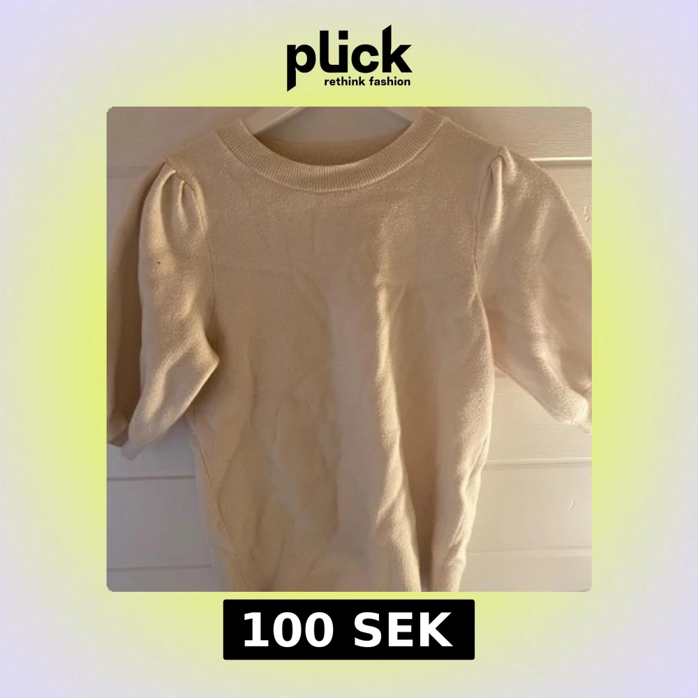 Säljer en söt beige stickad tröja med korta puffärmar och rund halsringning från lager157. Perfekt att styla till både jeans och kjol för en trendig look. Tröjan har en mjuk känsla och ribbad kant vid halsen.